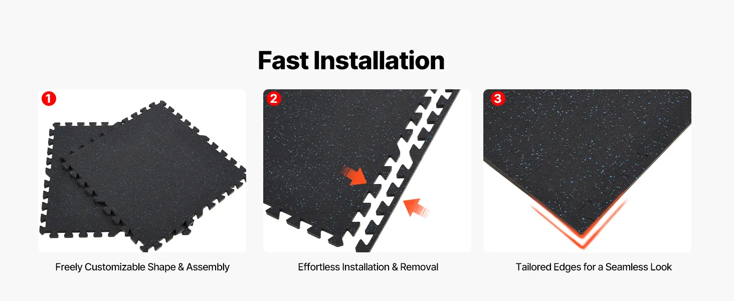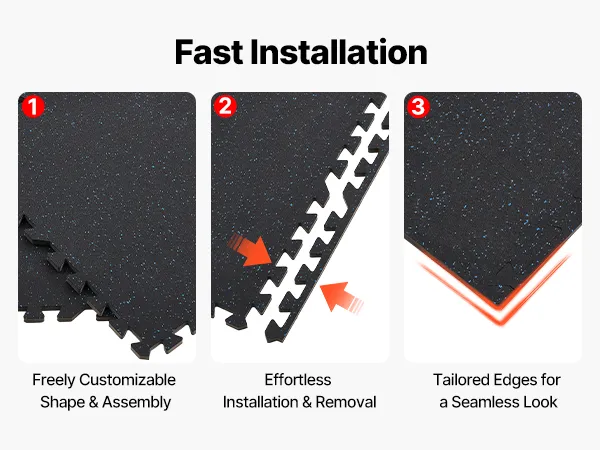Diseño flexible: Este juego de colchonetas de gimnasio cuenta con un diseño entrelazado que permite una instalación rápida y sin herramientas por una sola persona. Se puede unir y expandir libremente según las necesidades de espacio, o cortar para adaptarse a áreas irregulares
