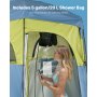 Amplias opciones de almacenamiento: Esta tienda cambiador ofrece la comodidad de estar en casa al aire libre. Cuelga toallas en el tendedero, fija una lámpara o un cabezal de ducha al gancho superior y mantén todos tus artículos esenciales a mano en la bolsa de almacenamiento. También incluye una bolsa de ducha de 19 litros para 1 o 2 personas