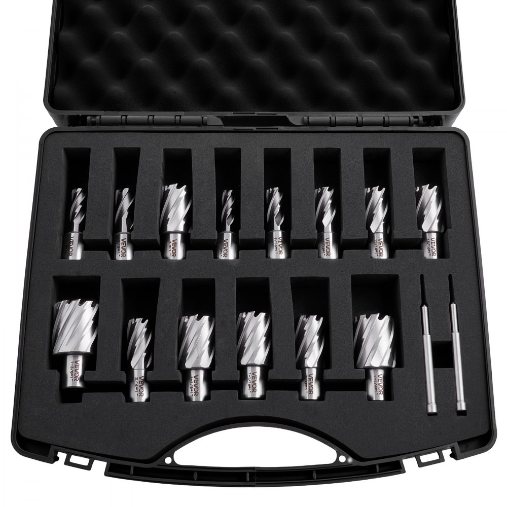 VEVOR Juego de Cortadores Anulares 16 Piezas, Juego de Brocas HSS M2AL de Vástago Weldon, Profundidad de Corte 25,4mm, Diámetro 11,11-34,92mm con 14 Cortadores, 2 Pasadores Guía para Taladro Magnético