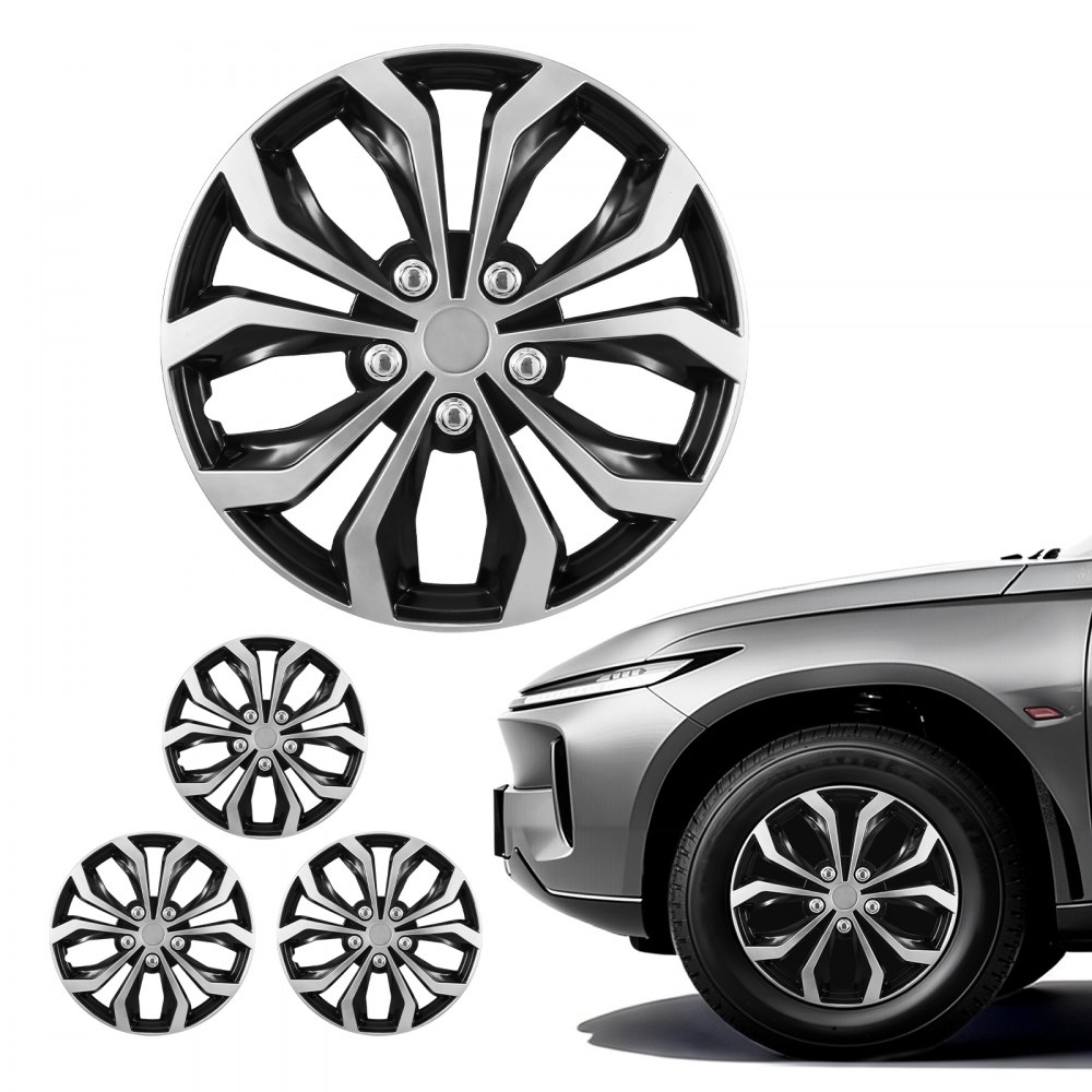 VEVOR Juego de 4 Tapacubos 15 pulgadas, Embellecedores de Rueda R15, Tapacubos Universales de 10 Radios de ABS, Resistente y Duradero, para Llantas de Hyundai, Chevrolet, Ford, Honda, Plata y Negro