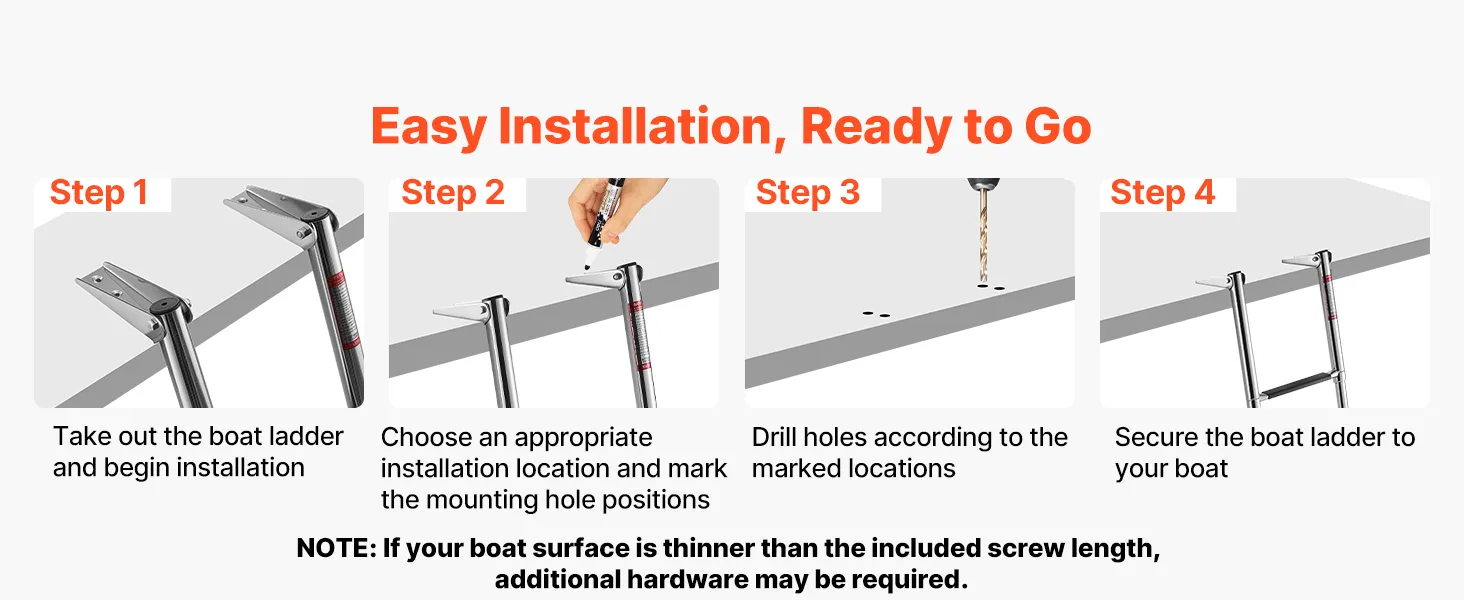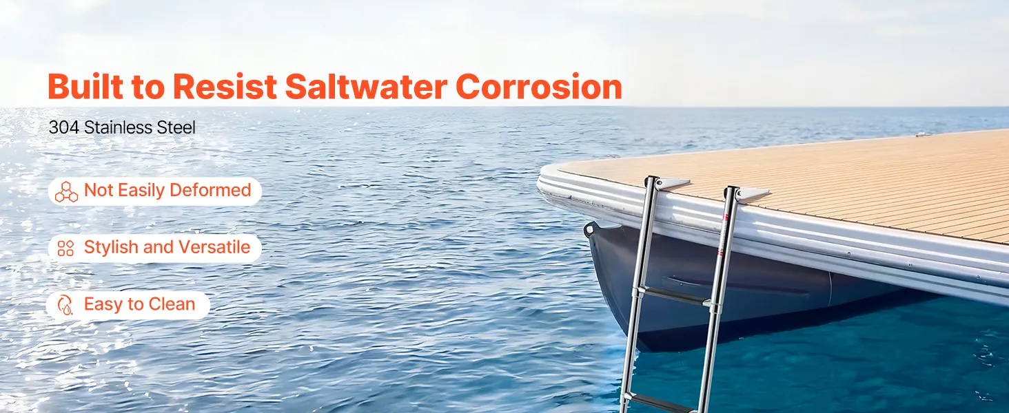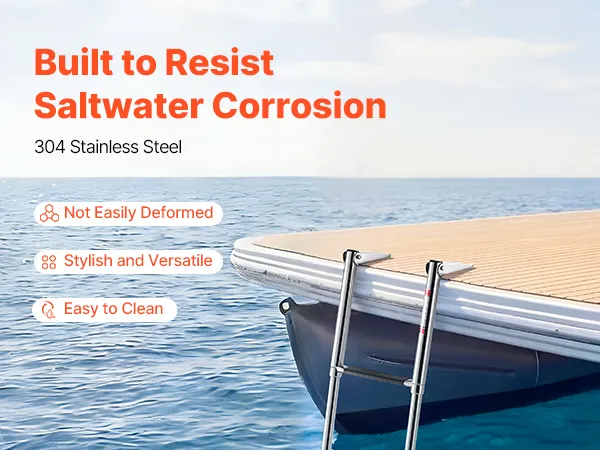Construcción en acero inoxidable 304: Esta escalera para barcos de 4 peldaños está fabricada en acero inoxidable 304, ofreciendo una excelente resistencia a la corrosión y un rendimiento duradero incluso en entornos marinos de agua salada