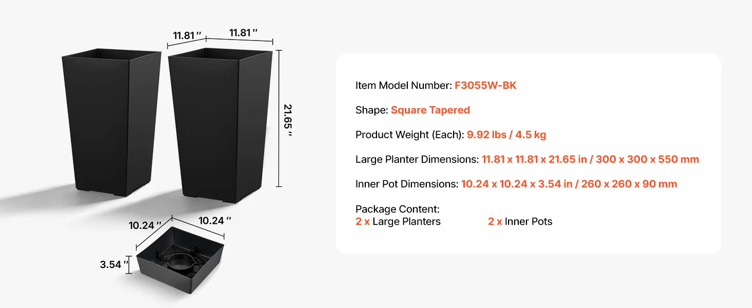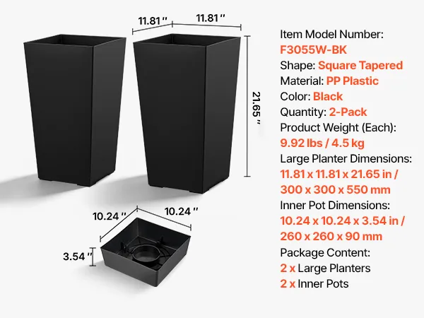 VEVOR Macetas Altas para Plantas 550 mm, Paquete de 2 Piezas, Maceteros Grandes para Interior y Exterior, Cónico Cuadrado, Diseño Moderno, con Depósito, Plástico, para Jardín Patio Salón, Color Negro