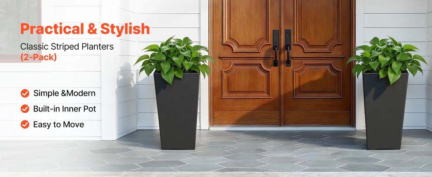 Estas macetas altas presentan un aspecto limpio y minimalista, que encaja a la perfección en un porche, entrada, patio o jardín, y funcionan igual de bien en interiores o en una oficina: una forma sencilla de añadir vegetación y estilo a cualquier lugar.