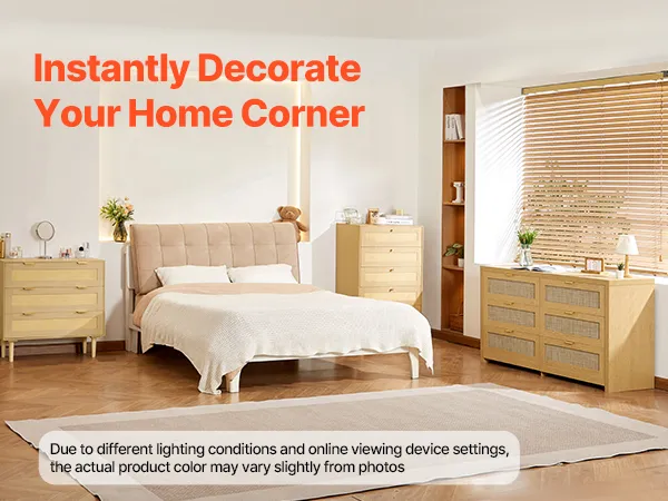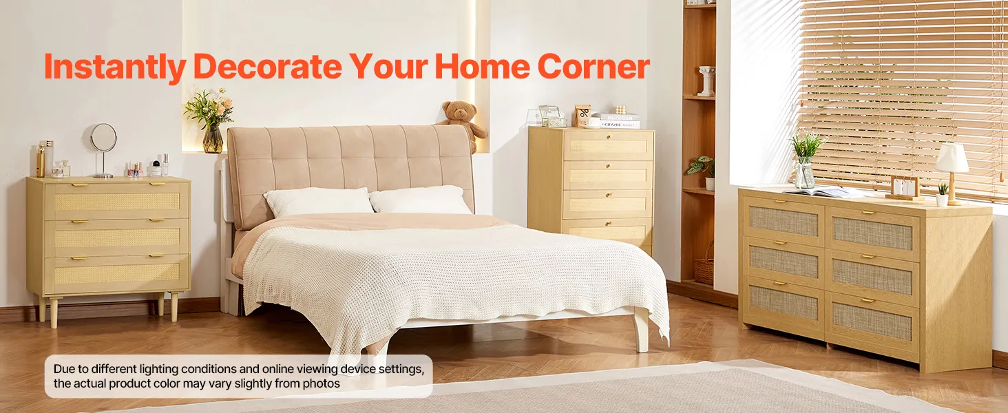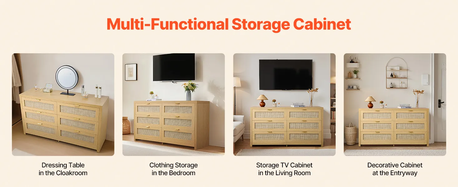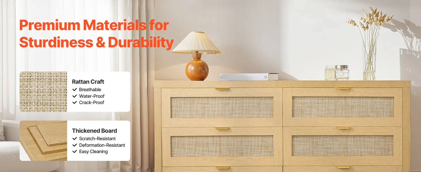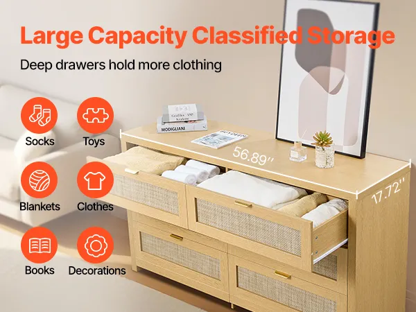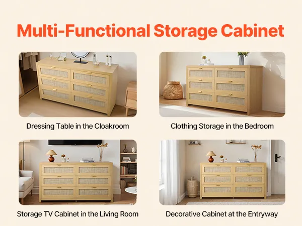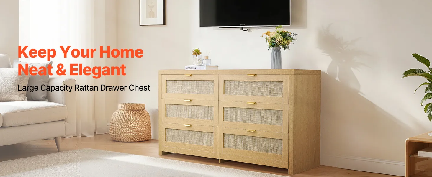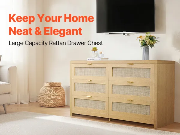 Cómoda espaciosa de ratán: Esta cómoda de ratán para dormitorio cuenta con seis cajones de 22 cm de profundidad cada uno, que ofrecen un amplio espacio de almacenamiento para ropa, libros, mantas y juguetes. Su amplia superficie es ideal para exhibir marcos de fotos y objetos decorativos