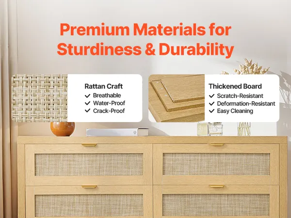 La cómoda, gracias a su estructura de ratán transpirable, reduce la humedad interior y mantiene los objetos secos. Los gruesos tableros soportan cajones completamente cargados sin deformarse ni dañarse.