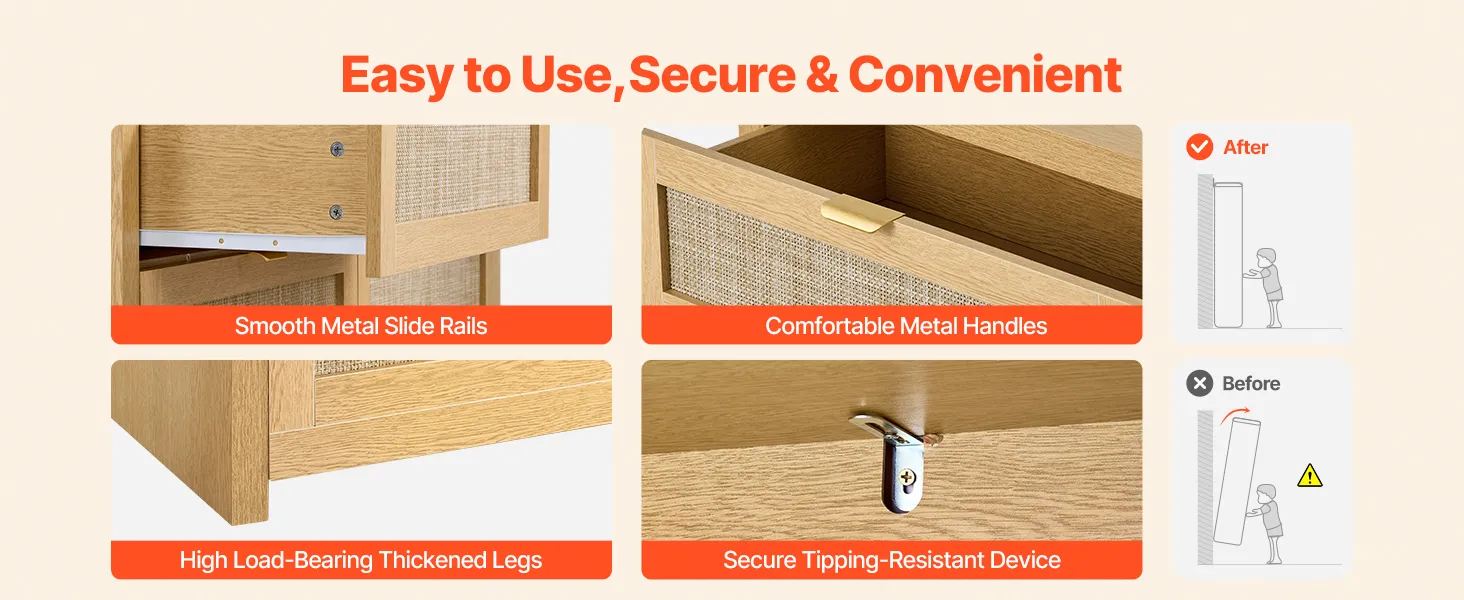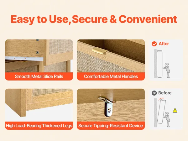 Nuestra cómoda cuenta con tiradores metálicos para un agarre cómodo y guías de deslizamiento suave. Sus patas robustas y el sistema antivuelco garantizan un uso fiable, permitiendo que la cómoda resista el desgaste diario y conserve su aspecto impecable durante años.