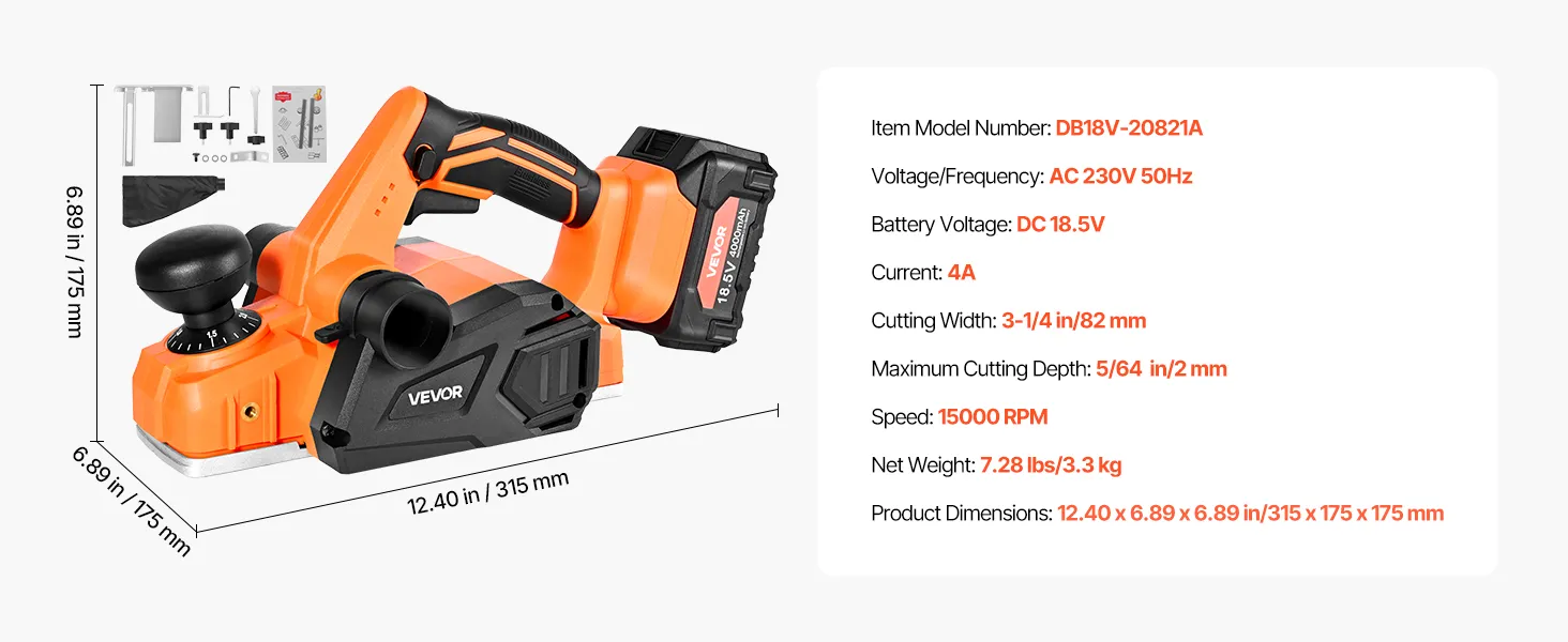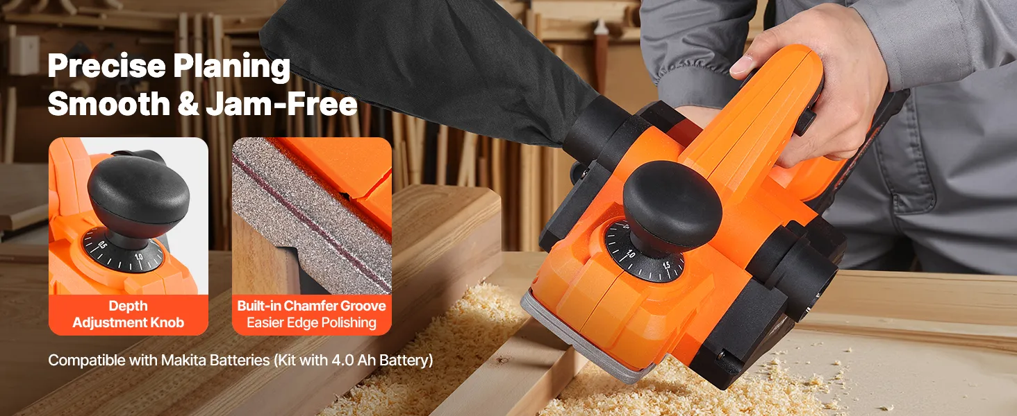Corte eficiente y preciso: La cepilladora eléctrica inalámbrica cuenta con un motor sin escobillas de 18 V integrado, con un ancho de cepillado máximo de 82 mm y una profundidad de 2 mm. Permite un corte sin esfuerzo, eficiente y preciso, ahorrando tiempo y esfuerzo