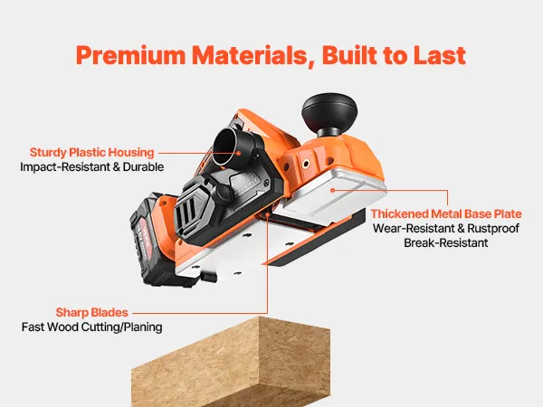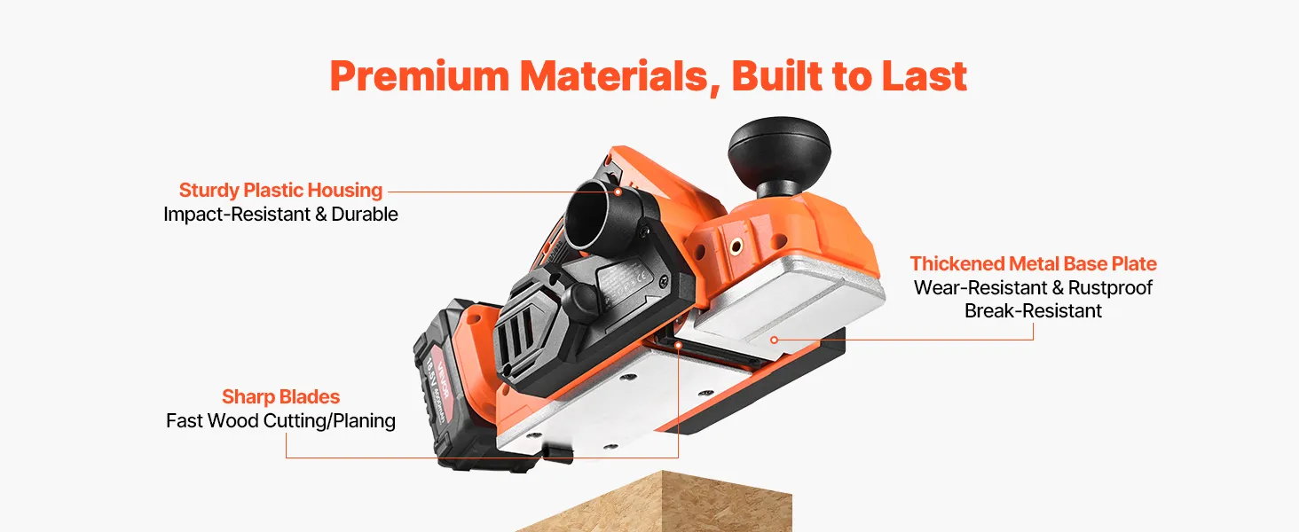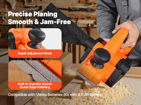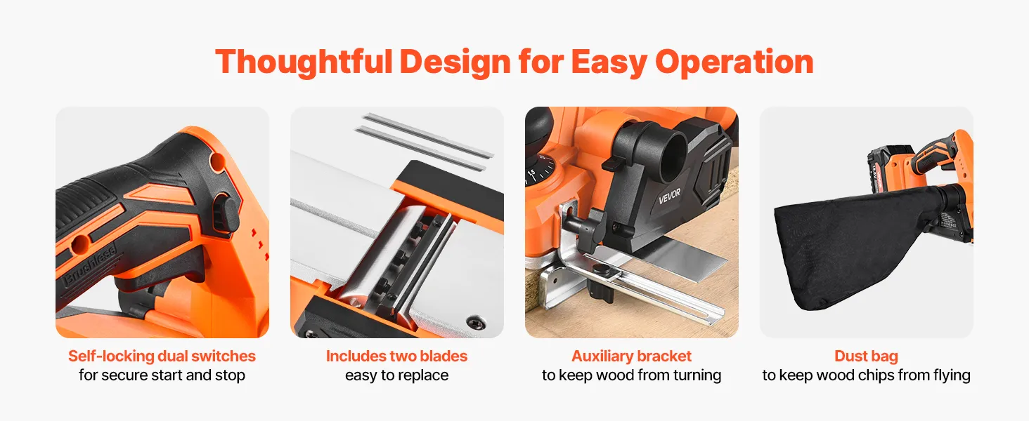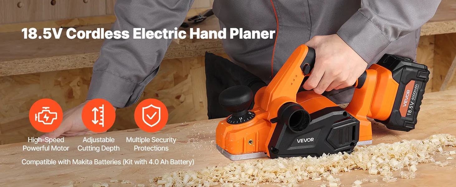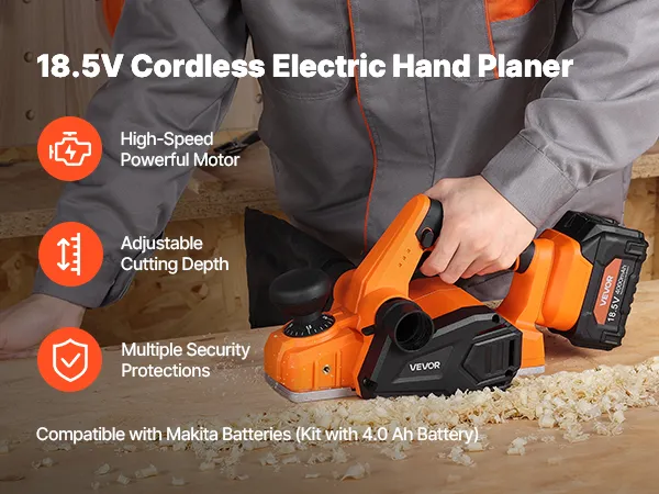 Impulsado por un motor de alta velocidad con protección integrada, este cepillo manual inalámbrico maneja varias tareas de carpintería con facilidad, ahorrando tiempo y esfuerzo.