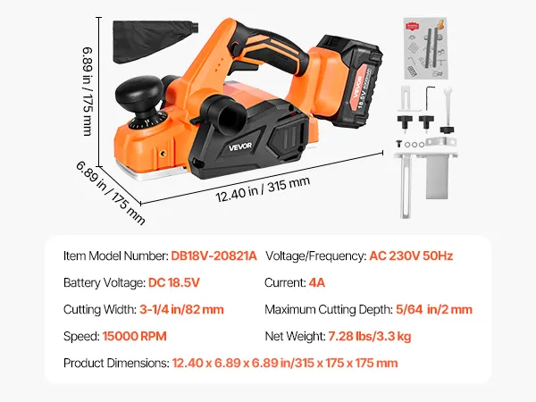 VEVOR Cepilladora Inalámbrica para Madera, Ancho de Corte 82 mm, 15 000 RPM, con Batería de Litio 4,0 Ah y 18 V, Motor sin Escobillas, Profundidad de Corte Ajustable y Bolsa de Recogida de Polvo