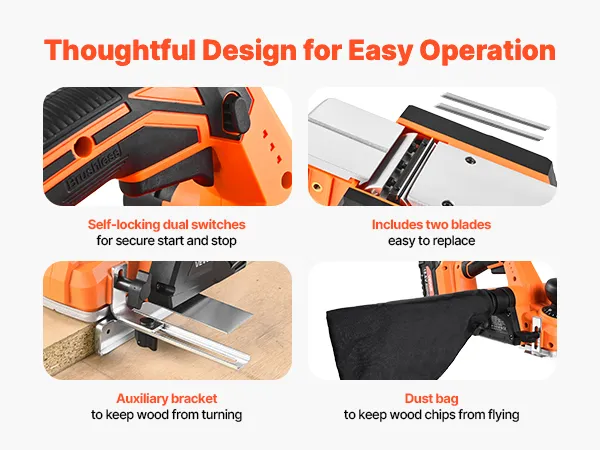 Múltiples sistemas de seguridad: La cepilladora eléctrica cuenta con un diseño de doble interruptor para evitar el arranque accidental y brindar seguridad durante el trabajo. El soporte inferior protege las cuchillas contra daños, mientras que la guía paralela garantiza cortes precisos