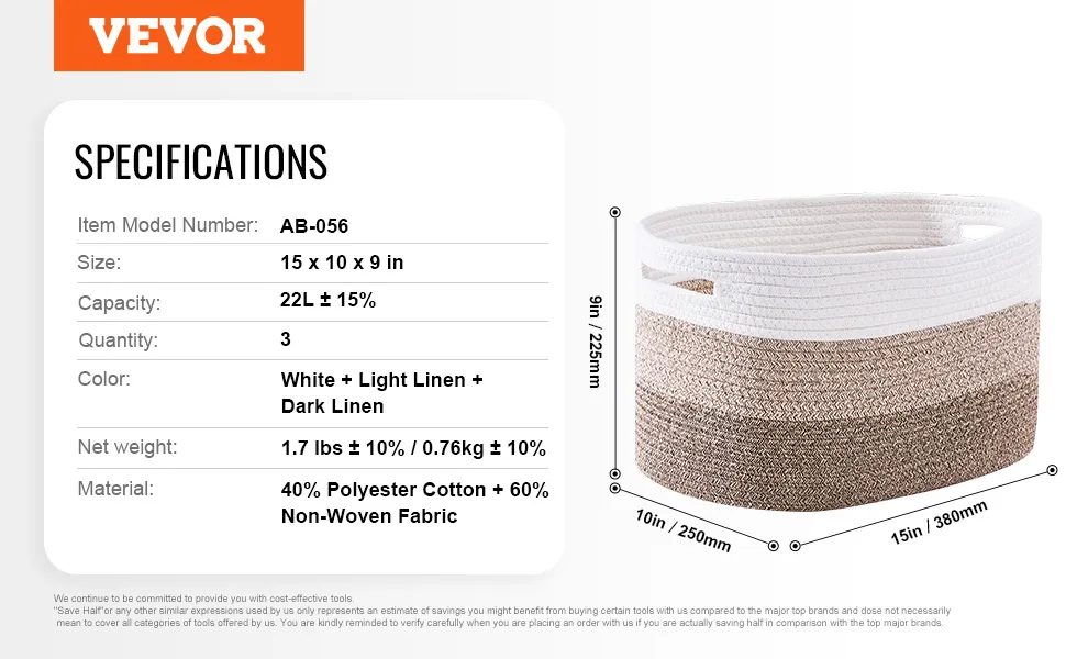 Fabricadas con un 40% de algodón poliéster y un 60% de tela no tejida, las cestas están firmemente tejidas con una estructura gruesa y duradera que mantiene su forma y permanece resistente cuando está llena.