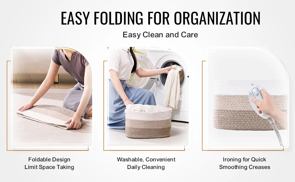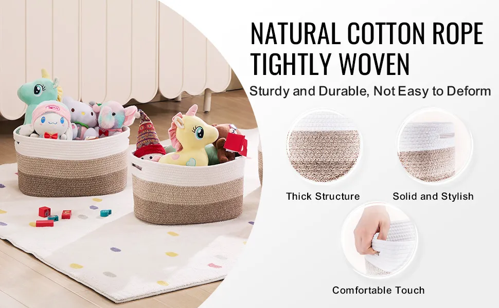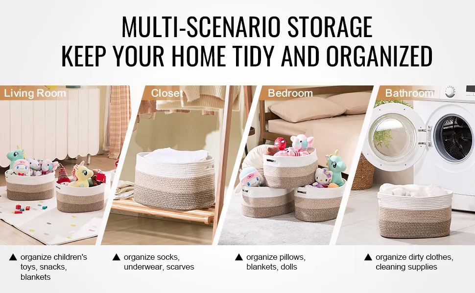 Uso versátil: ideales para una variedad de necesidades de almacenamiento, las cestas de almacenamiento de algodón grandes y resistentes son adecuadas para organizar ropa, artículos para bebés, juguetes, almohadas, mantas y otros artículos esenciales del hogar, lo que las convierte en la excelente opción para mantener una casa ordenada y organizada.