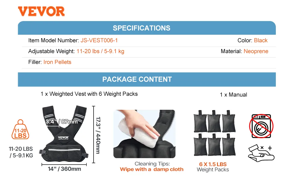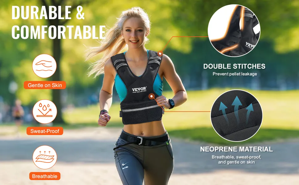 Este chaleco con peso ajustable está fabricado con neopreno de primera calidad y es transpirable, resistente al sudor y suave con la piel. Su construcción con doble costura evita la fuga de gránulos de hierro, lo que garantiza la estabilidad y la ausencia de olores desagradables.