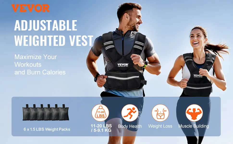 VEVOR Chaleco con Peso Ajustable 5-9,1 kg con 6 Pesas de Hierro y Banda Reflectante, Conjunto de Ejercicios con Chaleco con Peso Corporal Unisex, Equipo para Entrenamiento de Fuerza, Correr y Trotar