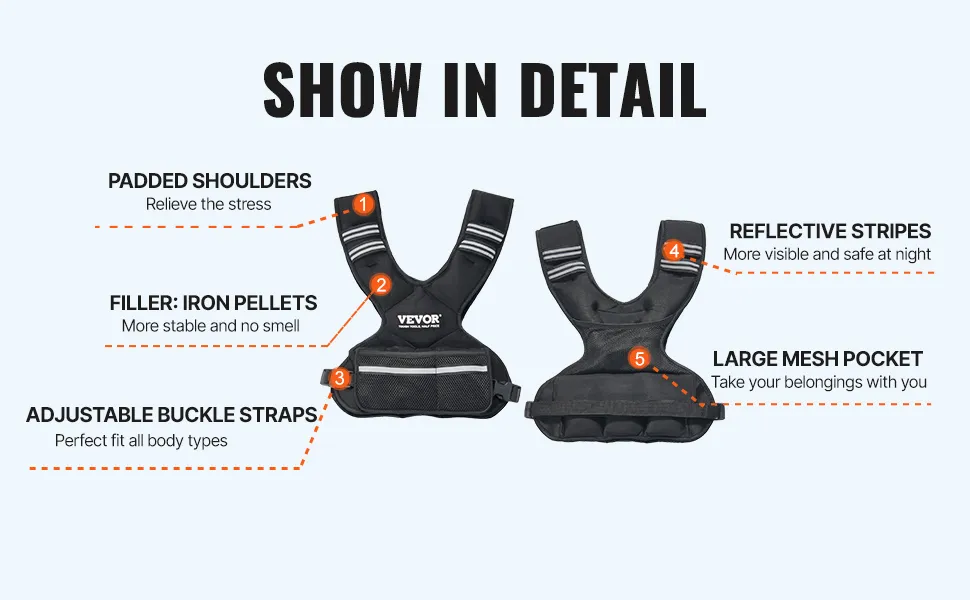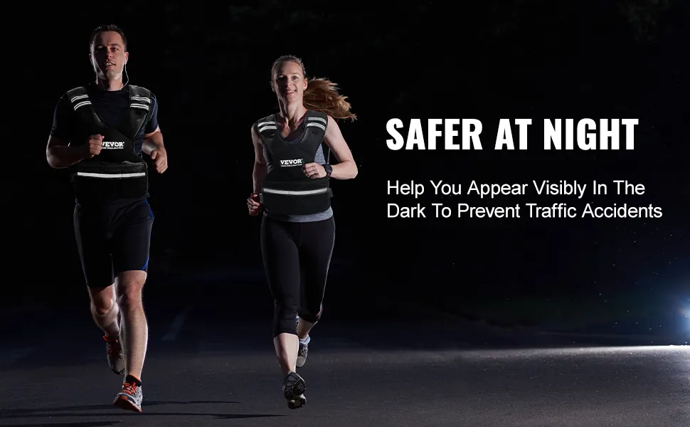 Detalles bien pensados: manténgase visible y seguro durante las actividades nocturnas con múltiples franjas reflectantes. El chaleco con peso ajustable también cuenta con un bolsillo de malla grande, perfecto para llevar sus pertenencias mientras hace ejercicio.