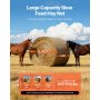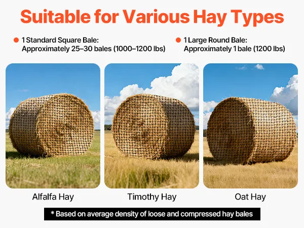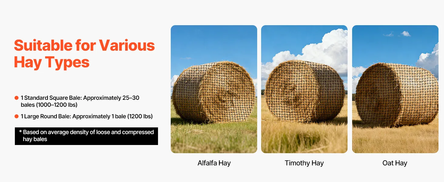 Gran capacidad: Con unas dimensiones de 1,5 x 1,5 x 1,5 m, esta red para pacas redondas tiene capacidad para entre 450 y 680 kg de heno, incluyendo pacas de alfalfa y fleo. Su amplia abertura facilita el llenado, y las correas ajustables sujetan el alimento, garantizando una alimentación eficiente para el ganado