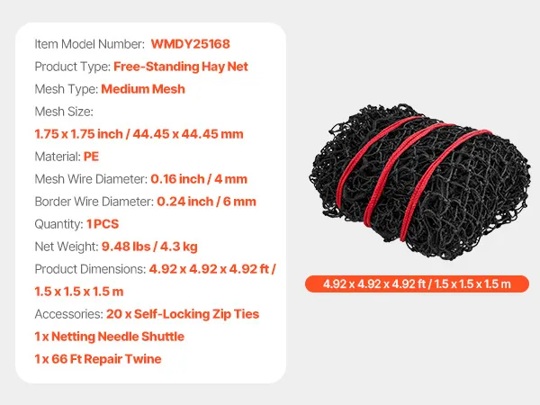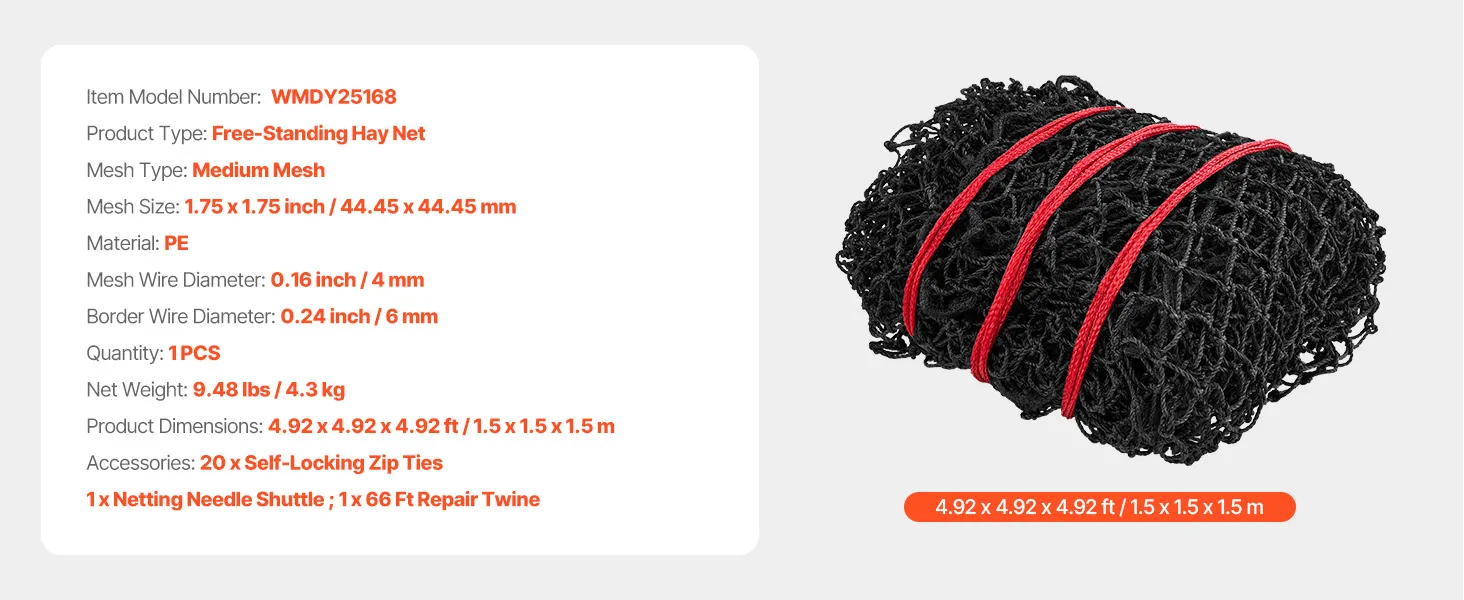 VEVOR Red para Pacas Redondas de Alimentación Lenta a Caballos, 1,5 x 1,5 x 1,5 m, Agujeros 44,45 x 44,45 mm, PE, Diseño Reforzado con Nudos, con Bridas, Lanzadera de Aguja y Cordel de Reparación
