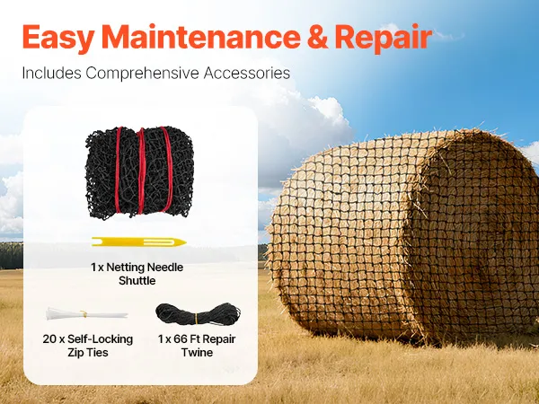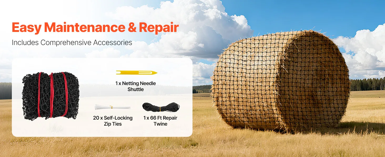 Esta red para pacas de heno permite reparaciones rápidas y reemplazos parciales gracias a los accesorios incluidos. Facilita el mantenimiento y prolonga su vida útil, reduciendo los costos de reemplazo para un uso rentable a largo plazo.
