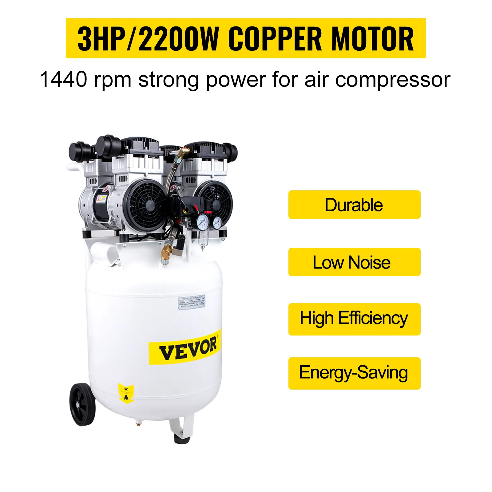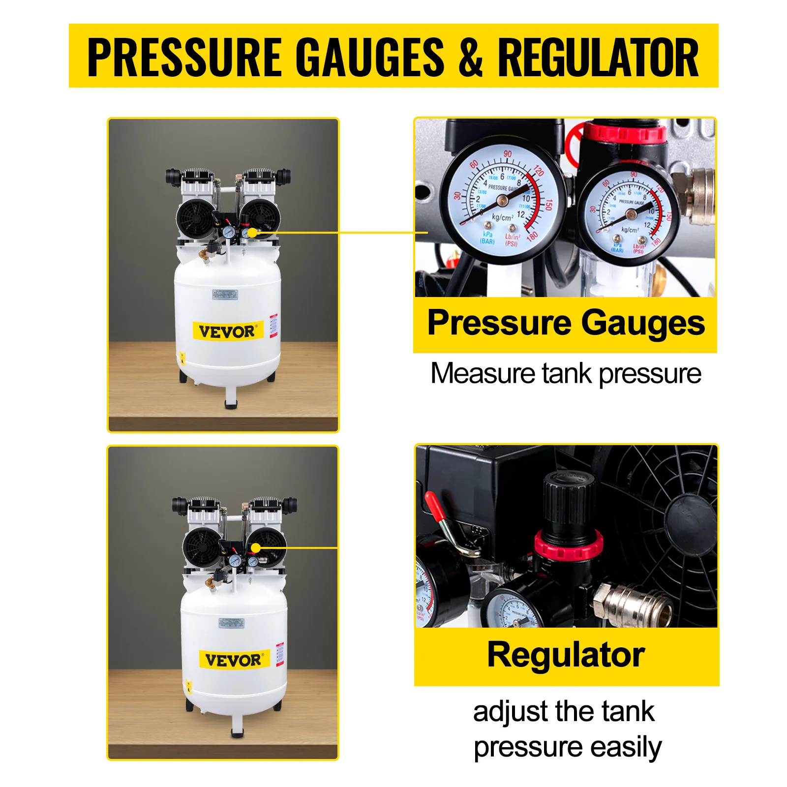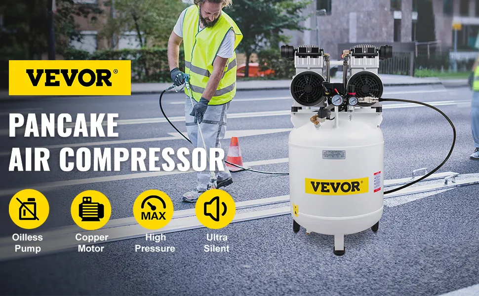 Este compresor de aire sin aceite utiliza motores de cobre ultra silenciosos y bombas sin aceite, de alta eficiencia y sin mantenimiento. El compresor de aire está equipado con un manómetro y una válvula de seguridad, que es seguro de operar; al mismo tiempo, también es fácil de mover. Por lo tanto, es una buena opción para reparaciones en el hogar, inflado de neumáticos, limpieza de vehículos, herramientas neumáticas, etc.