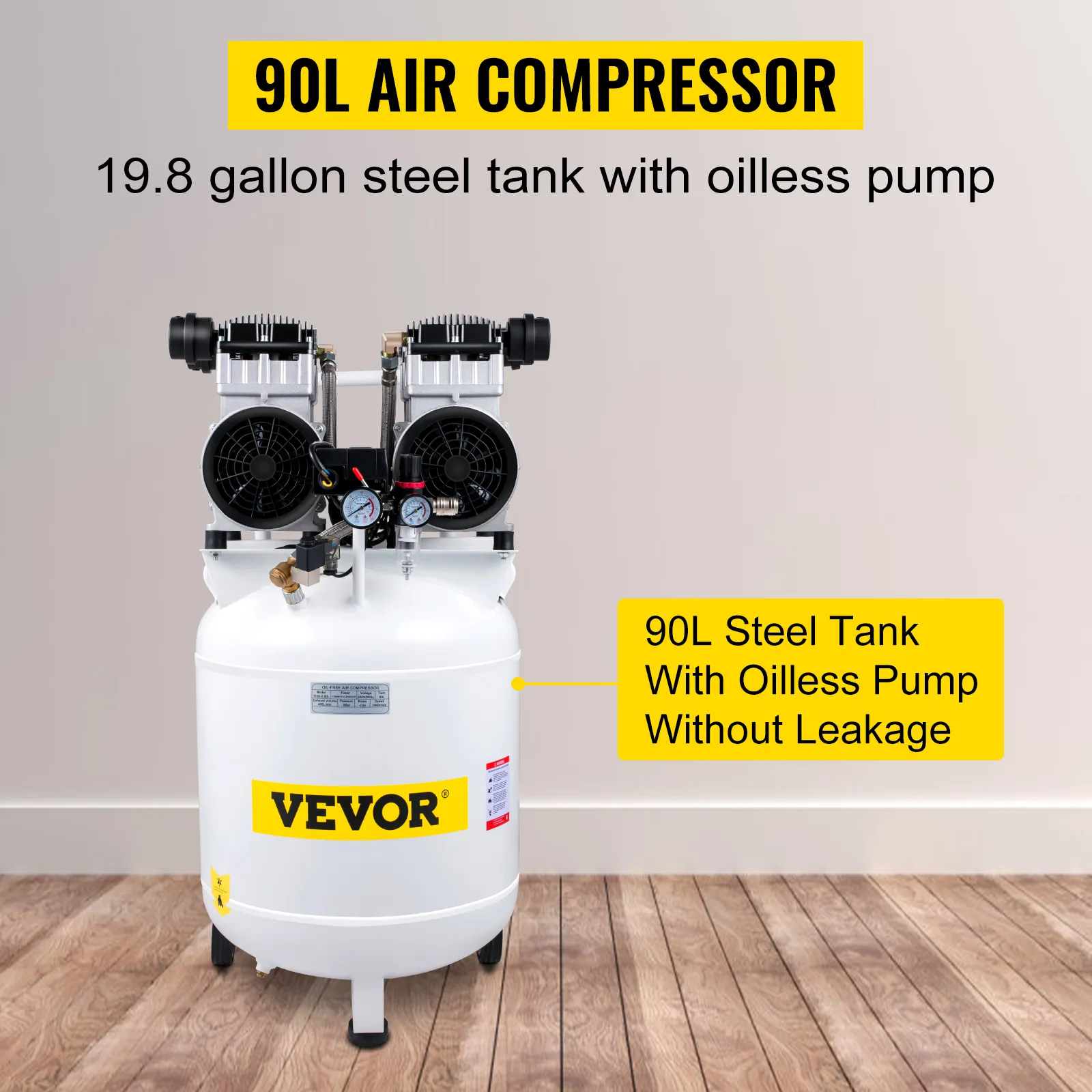 El compresor de aire contiene un tanque de combustible de acero de 90 L / 19,8 galones, que es resistente y a prueba de fugas para satisfacer su uso diario. Además, la bomba sin aceite no requiere mantenimiento diario.