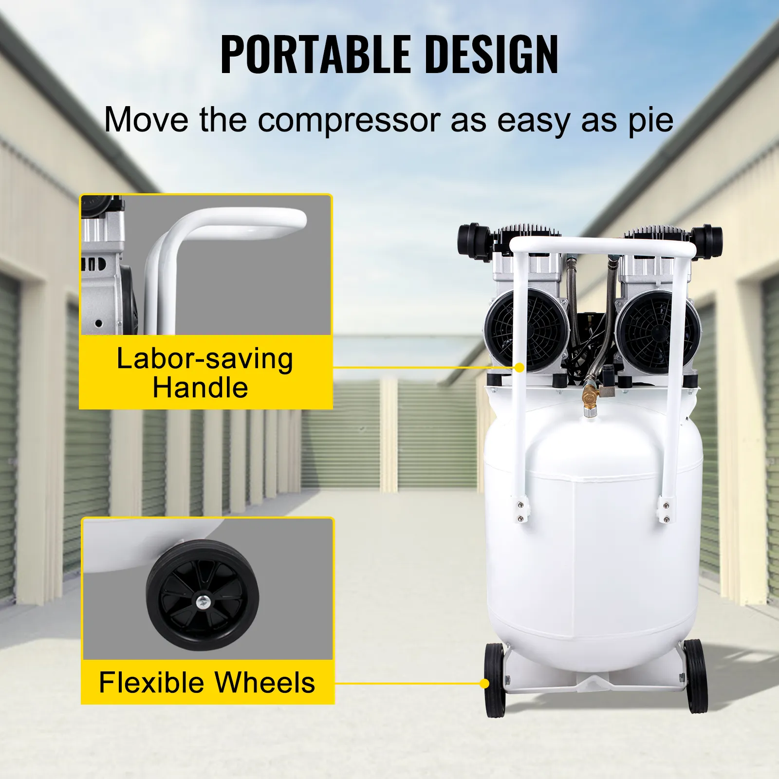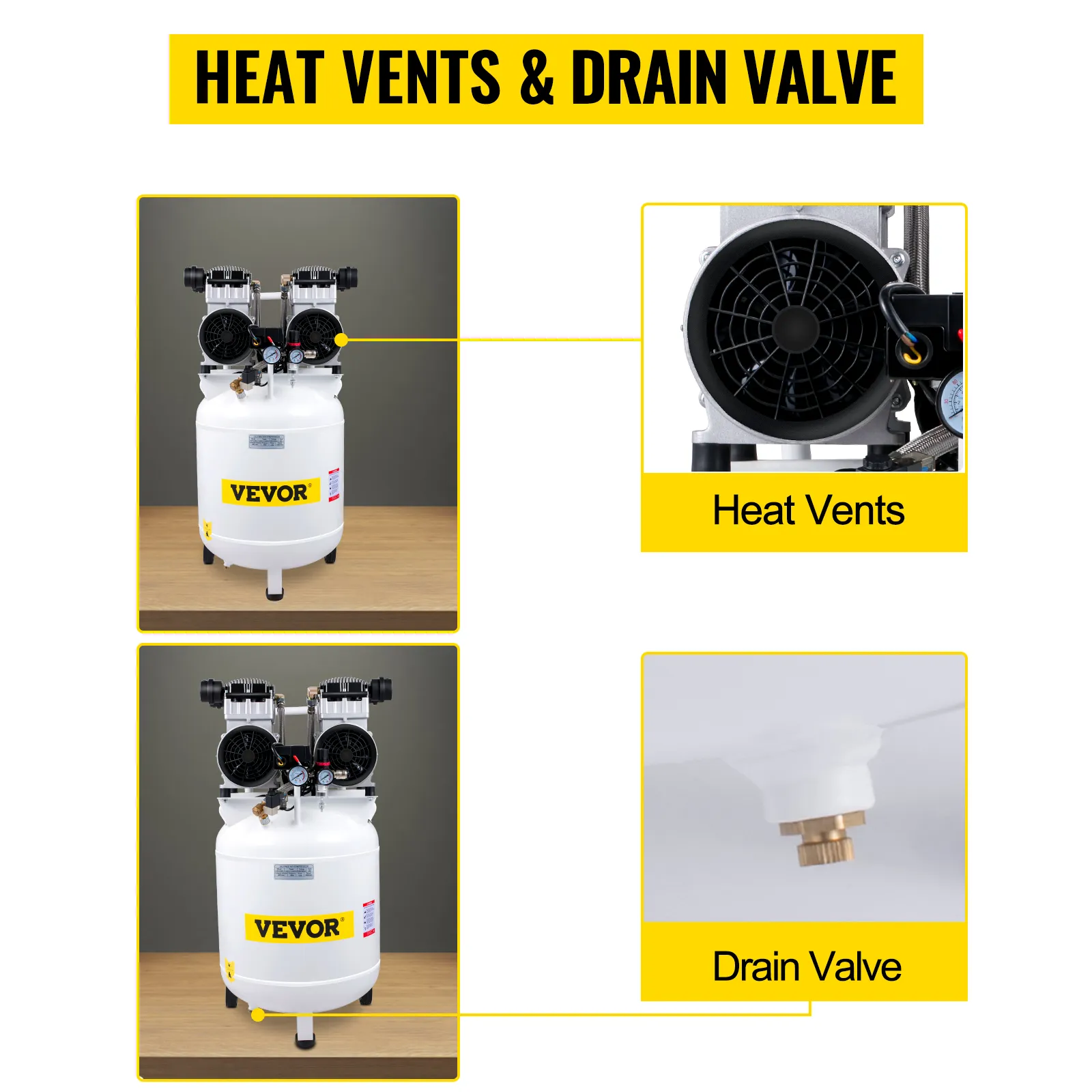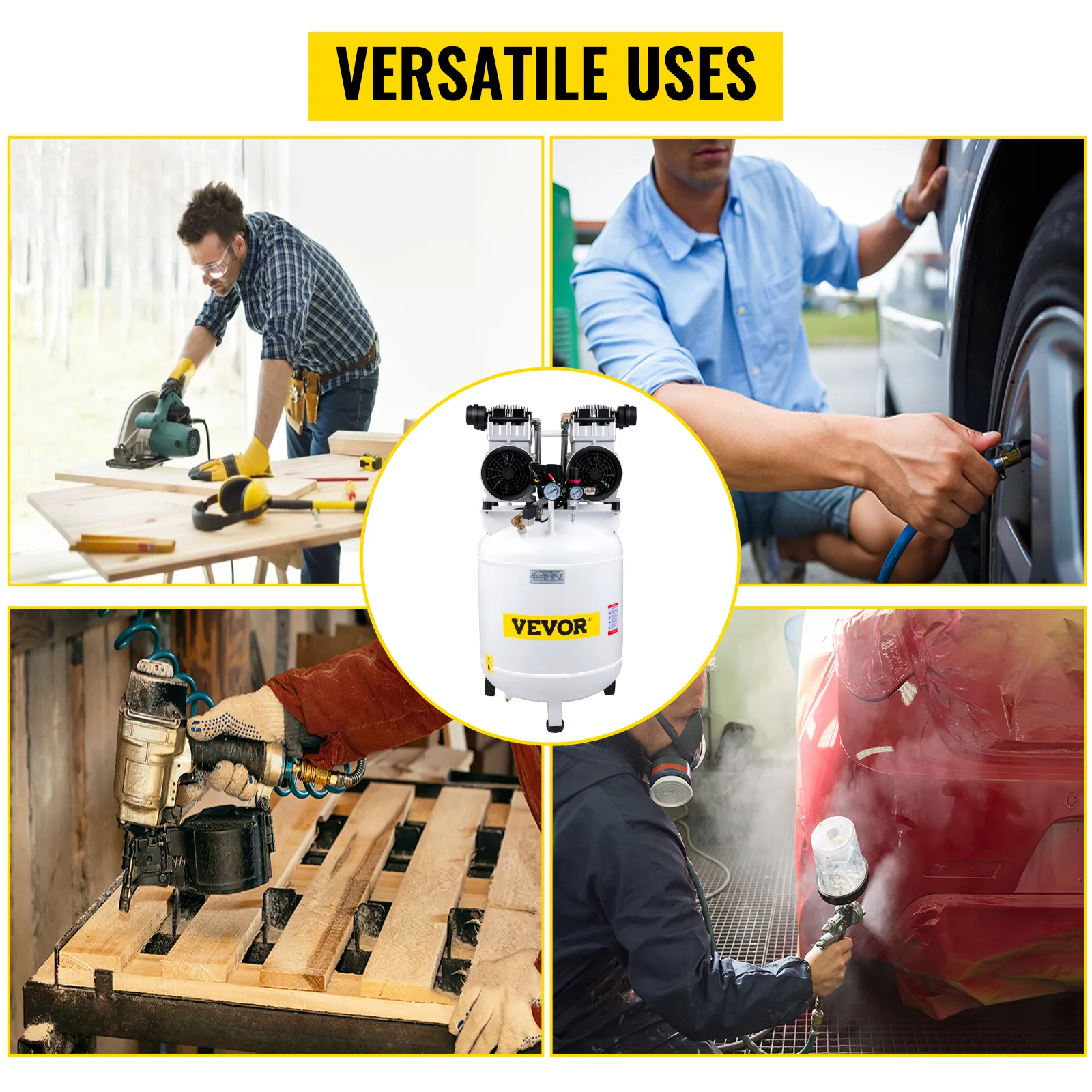 El compresor de aire sin aceite es adecuado para reparaciones en el hogar, inflado de neumáticos, limpieza de vehículos, odontología médica, etc. Compatible con diversas herramientas neumáticas como clavadoras, pistolas de calafateo, brocas, pistolas rociadoras, etc.