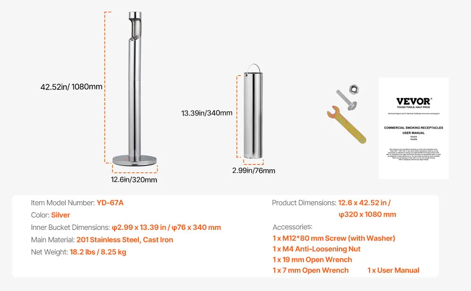 VEVOR Cenicero para Cigarrillos de φ32 x 108 cm Contenedor para Colillas Cenicero Cilíndrico Independiente Cenicero de Acero Inoxidable y Hierro para Exterior, Jardín, Oficina, Restaurante, Plata