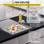 Hielera VEVOR con espuma aislante, botellas y tabla de temperaturas.