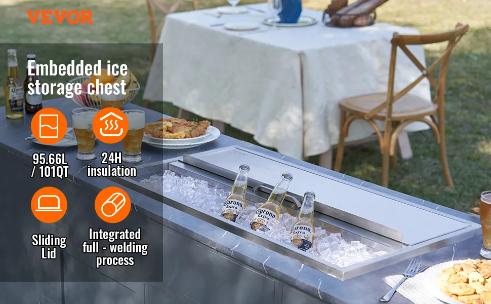 Esta hielera es versátil. Puede almacenar bebidas, guarniciones y otros artículos. Su gran capacidad la hace adecuada para varios usos. Puede usarla para mantener frías las bebidas. Además, puede usar esta herramienta para almacenar alimentos. Su tapa deslizante mantiene todo seguro. Esta hielera de acero inoxidable garantiza que los alimentos se mantengan frescos. Esta versatilidad la convierte en una valiosa incorporación a cualquier instalación al aire libre. Disfrute de la flexibilidad que aporta a su experiencia gastronómica al aire libre.