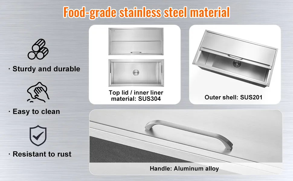 Esta hielera empotrable es perfecta para cocinas y bares al aire libre. Tiene una construcción de acero inoxidable para mantener tus bebidas frías durante largos períodos de tiempo. ¿Es ideal para exteriores? De hecho, el diseño de esta hielera empotrable garantiza que tus bebidas permanezcan frías durante períodos prolongados. ¡Puedes mantenerlas frías todo el tiempo! Para períodos prolongados, se adapta perfectamente a cualquier configuración de barra de hielo de cocina al aire libre. Su tapa deslizante facilita el acceso. Su manguera de drenaje simplifica la limpieza. Con una capacidad de 40,9 qt (4000 galones), puede contener suficiente hielo para cualquier reunión. Disfruta de bebidas frías o cócteles sin necesidad de recargas frecuentes. Es una excelente incorporación a cualquier área de entretenimiento al aire libre.