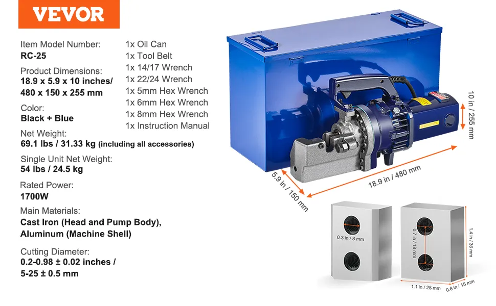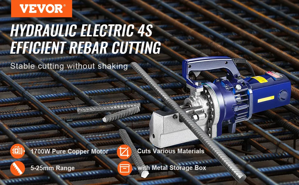 VEVOR Cortadora de Varillas de Refuerzo Hidráulica Eléctrica, 1700 W, hasta 5-25 mm en 4 Segundos, Acero de Alta Potencia con Caja de Herramientas y Lata de Aceite, Negro y Azul, 480 x 150 x 255 mm