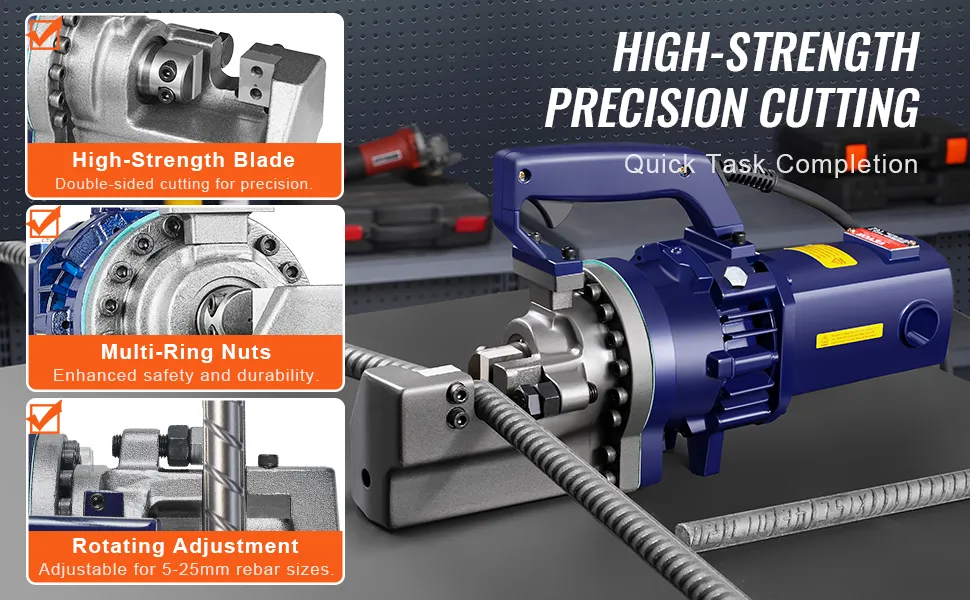 Nuestras hojas de alta calidad están diseñadas para cortar en ambos lados de la barra, mientras que la tuerca multianillo aumenta la seguridad y le permite girar la tuerca en la posición de corte para adaptarse a diferentes diámetros de barra de refuerzo.