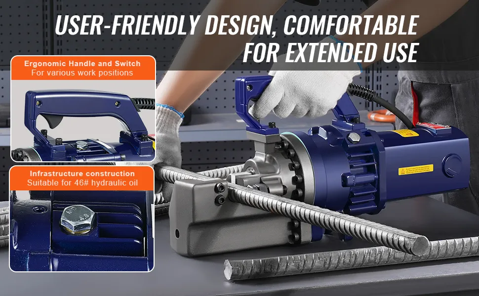 Corte rápido: la cortadora de varillas de refuerzo hidráulica eléctrica corta varillas de refuerzo sólidas con precisión en 4 segundos, lo que proporciona un corte suave y sin rebabas. Está equipada con un motor de cobre puro de 1700 W para un rendimiento potente.