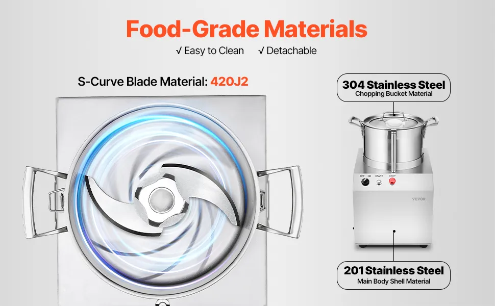 Material apto para uso alimentario: Todas las piezas que entran en contacto con los alimentos están fabricadas con acero inoxidable apto para uso alimentario. Las cuchillas y los accesorios son desmontables y aptos para lavavajillas, lo que facilita la limpieza.