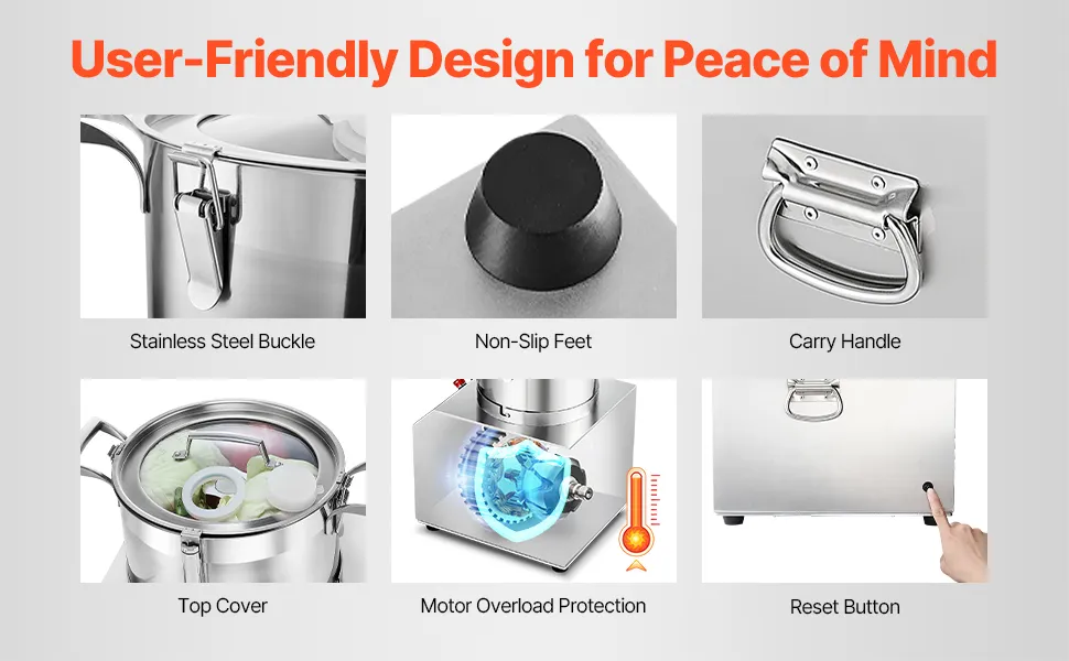 Nuestro procesador de alimentos está fabricado con un cuerpo de acero inoxidable con componentes fácilmente desmontables y lavables para un mantenimiento sin esfuerzo. Puede confiar en la calidad de los materiales que utilizamos para garantizar que sus alimentos se mantengan seguros.