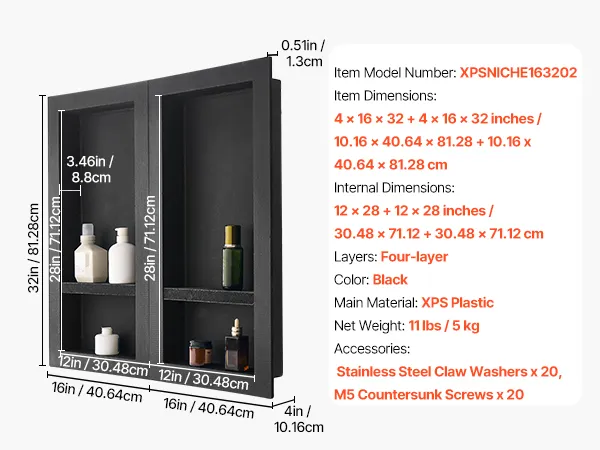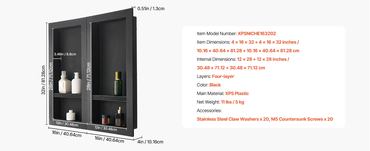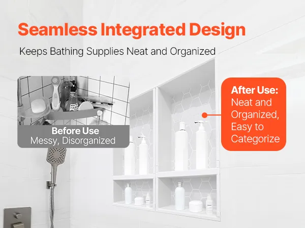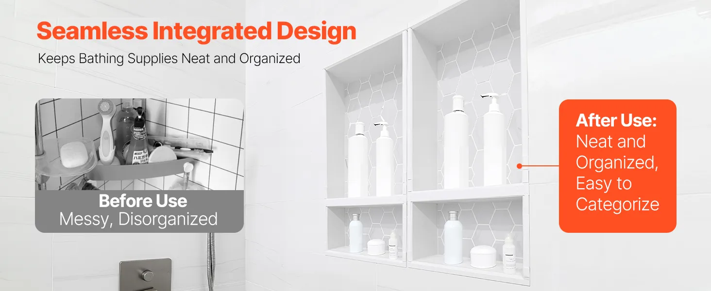 Fácil instalación: Incluye un kit de accesorios para instalación empotrada horizontal o vertical. Solo siga estos pasos: Paso 1: Determine la altura necesaria y dibuje una línea horizontal en la capa base. Paso 2: Corte a lo largo de la línea y retire la capa base superior. Paso 3: Use sellador impermeable para fijar el nicho a los montantes y sellar las juntas. Paso 4: Aplique mortero y fije las baldosas elegidas