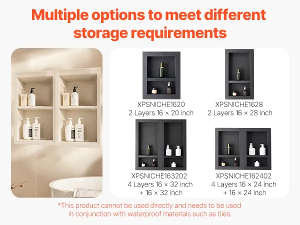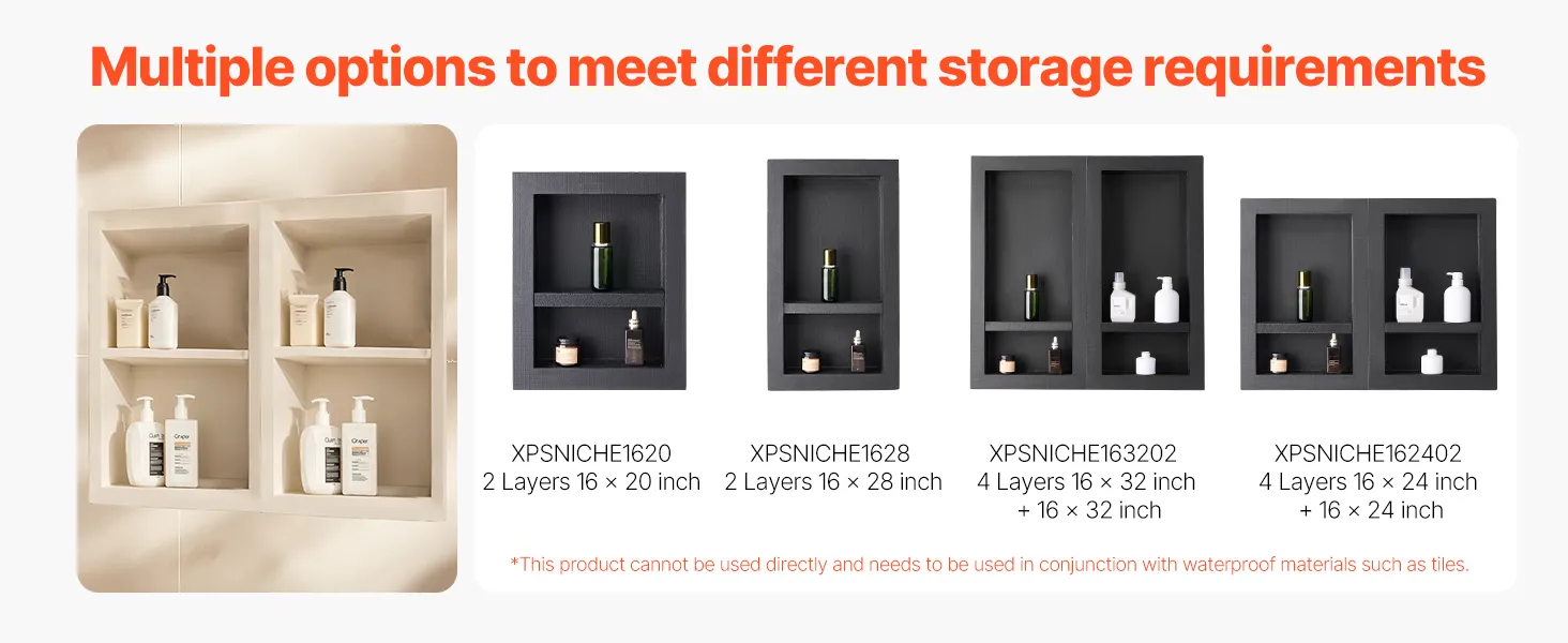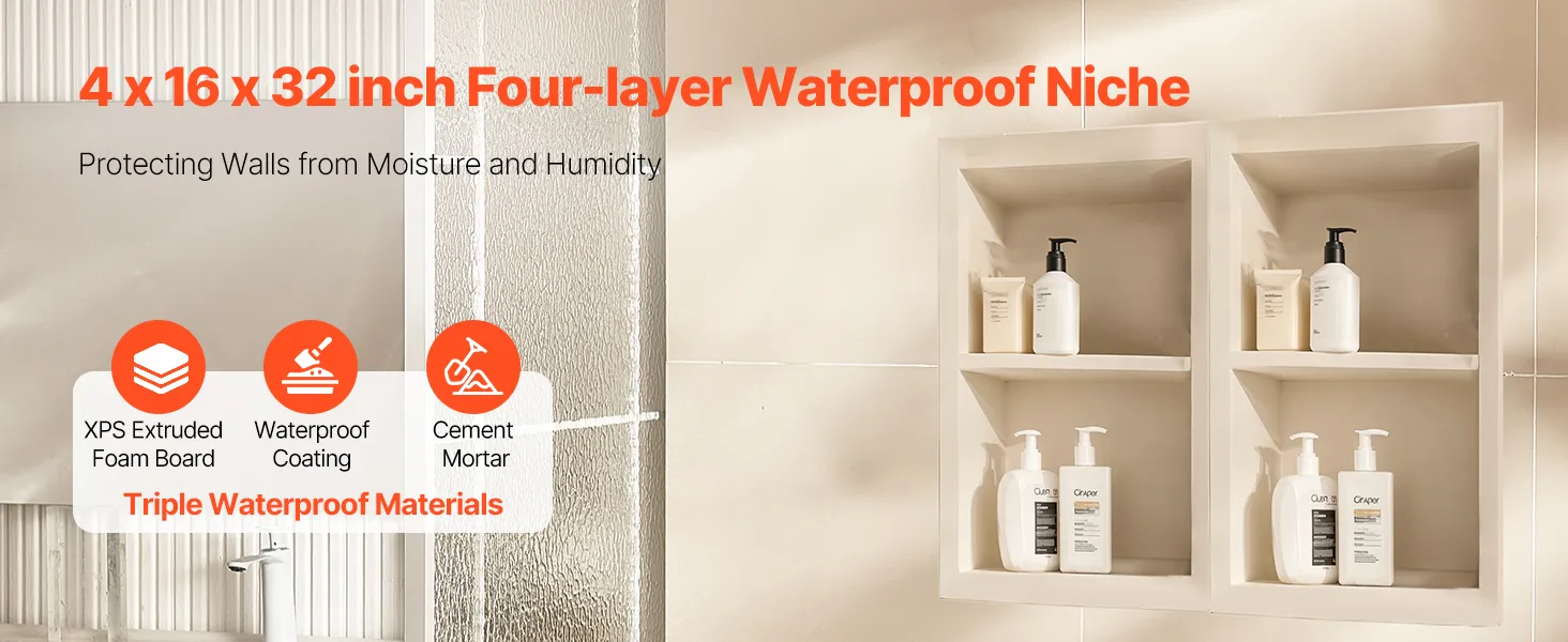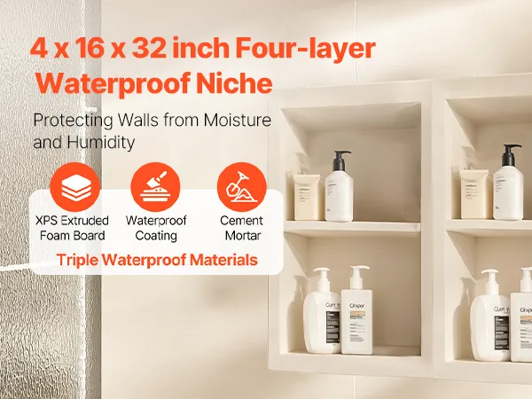 Sellado e impermeable: El nicho de ducha con inserto utiliza una base impermeable de triple capa de espuma XPS, mortero de cemento y revestimiento impermeable, lo que garantiza un sellado completo. Protege las paredes de la humedad, prolongando su vida útil y evitando la penetración de agua, manteniendo los interiores secos e higiénicos. Nota: Este producto debe usarse junto con materiales impermeabilizantes, no por sí solo