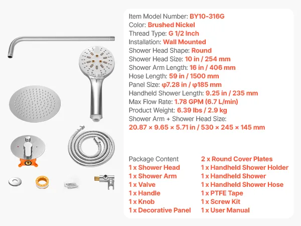 VEVOR Juego de Grifo de Ducha de Lluvia con Cabezal de Ducha Redondo 25,4 cm y Rociador de Mano, Grifería de Baño de Pared con Válvula de Latón y Kit de Embellecedor, 6,7 L/min, Níquel Cepillado