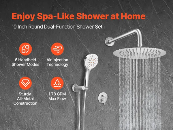Ducha de alta presión: Nuestro sistema de ducha de doble función ofrece una experiencia de lujo con tecnología de inyección de aire, que garantiza alta presión incluso con poca agua. Ahorre agua con un caudal de 6,7 L/min, ofreciendo una ducha relajante y estilo spa
