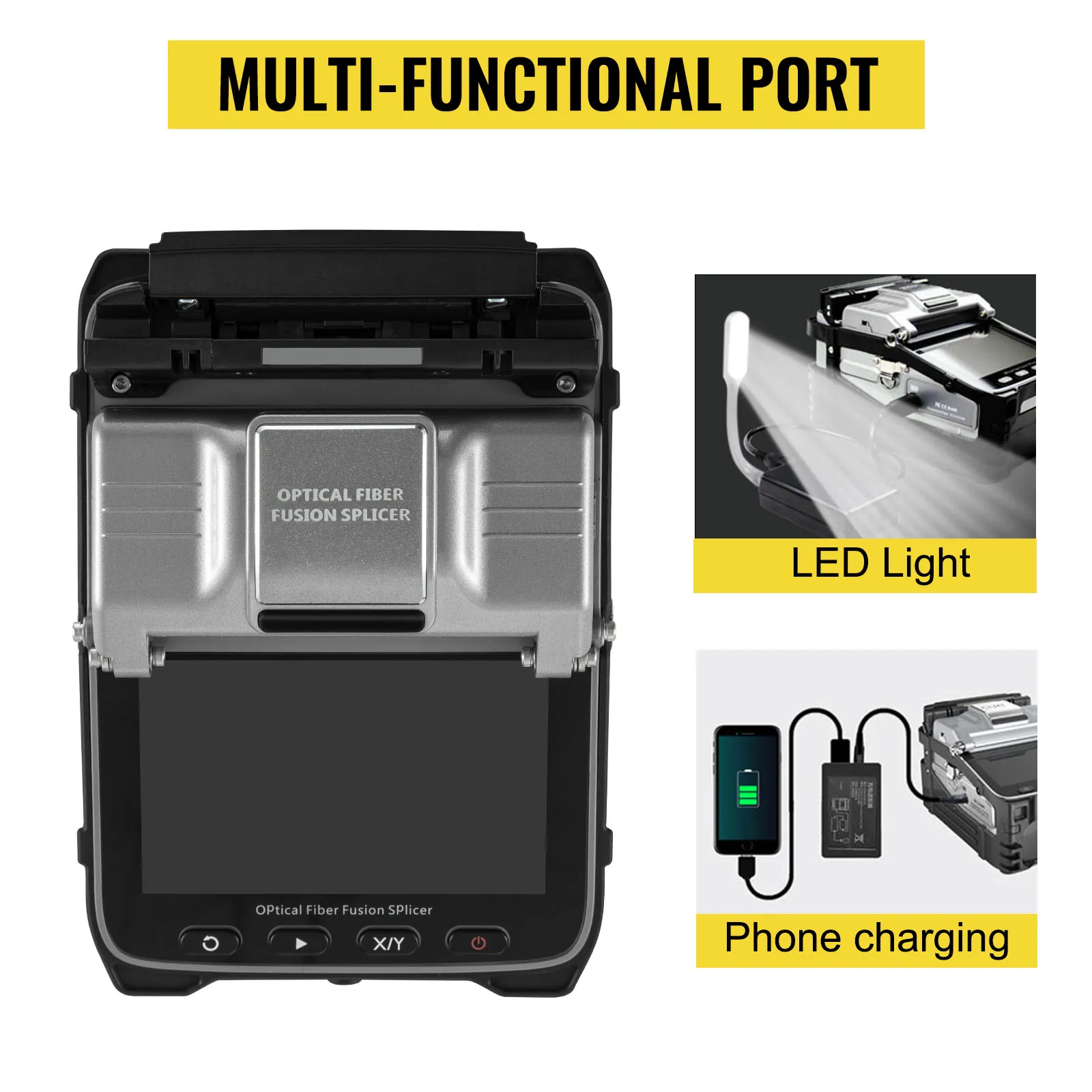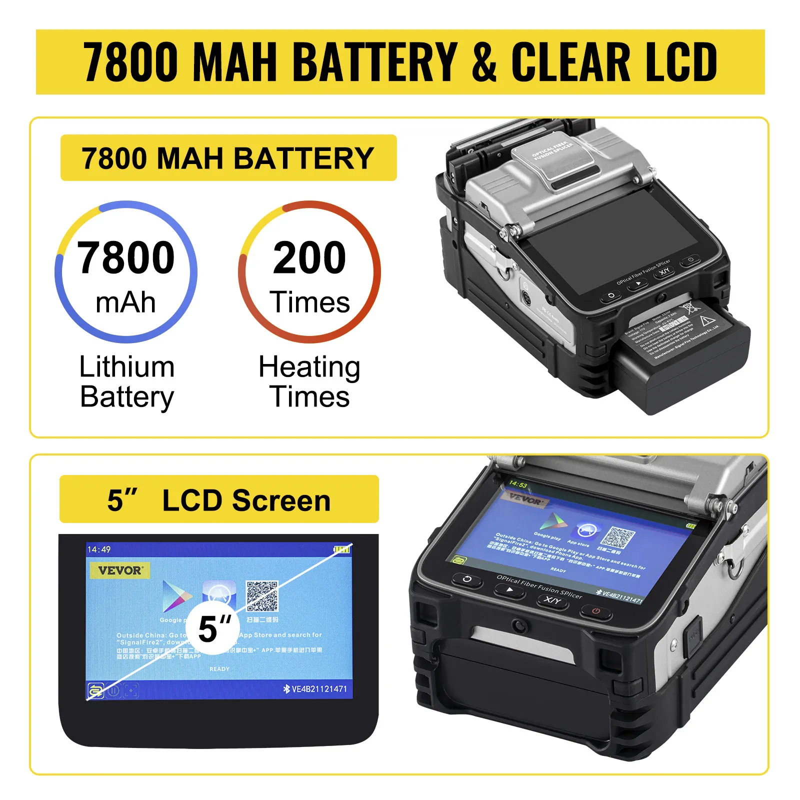 Pantalla LCD de alta resolución de 5 pulgadas. La máquina puede observar fácil y claramente la fibra óptica. La batería de litio de alta capacidad de 7800 mAh puede empalmar y calentar continuamente unas 200 veces.