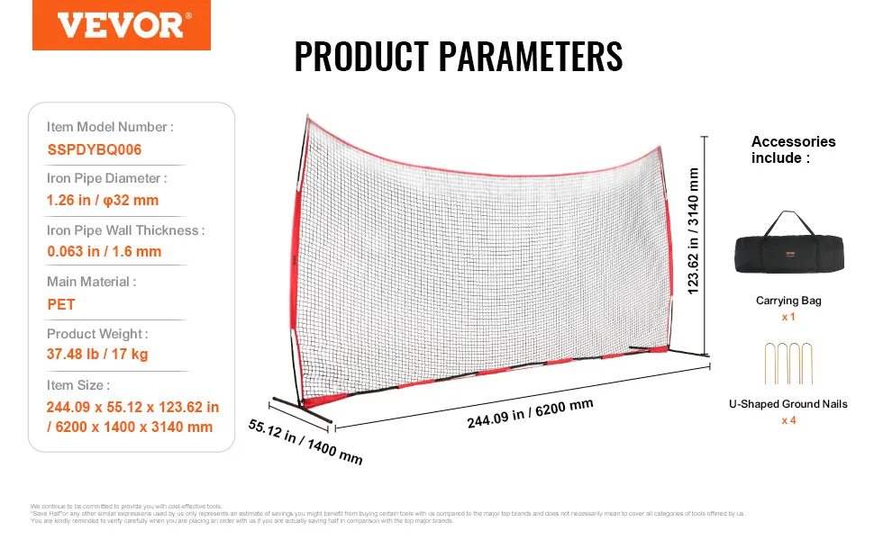 La red de protección de barricadas VEVOR es muy fácil de montar. Esta red incluye una bolsa de transporte para facilitar su transporte. Puede montarla y desmontarla rápidamente en minutos. Esta bolsa de transporte la hace ideal para sesiones de entrenamiento en movimiento. Es liviana, solo pesa 37,48 libras, lo que la hace perfecta para prácticas al aire libre. No importa si está en casa o en el campo, la instalación es sencilla. Con la bolsa de transporte incluida, el almacenamiento y el transporte son muy sencillos. Desde su patio trasero hasta el campo de deportes en sí, esta comodidad le garantiza que puede practicar en cualquier momento y en cualquier lugar.