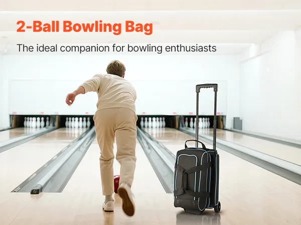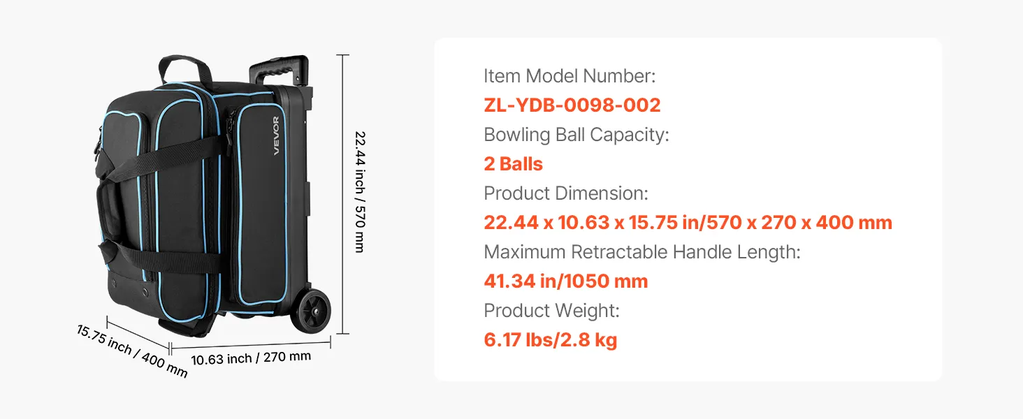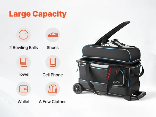 Nuestra bolsa de bolos con ruedas tiene capacidad para 2 bolas estándar en el compartimento principal, con un compartimento separado para zapatos resistente a la humedad, apto para la talla 16 de EE. UU.
