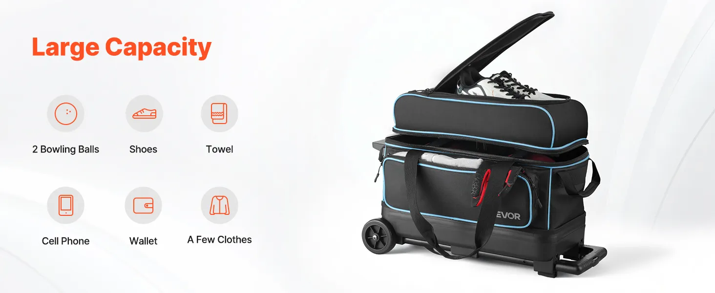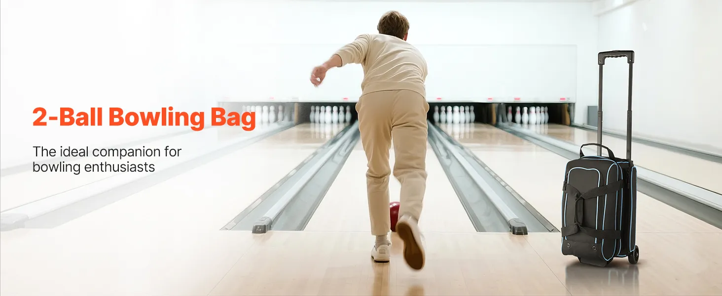 VEVOR Bolsa para 2 Bolas con Ruedas Dobles, Compartimento Separado para Zapatos hasta Talla 16 EE. UU. y Bolsillo Extragrande para Accesorios. Asa Retráctil Extensible hasta 105 cm, Negro Azul