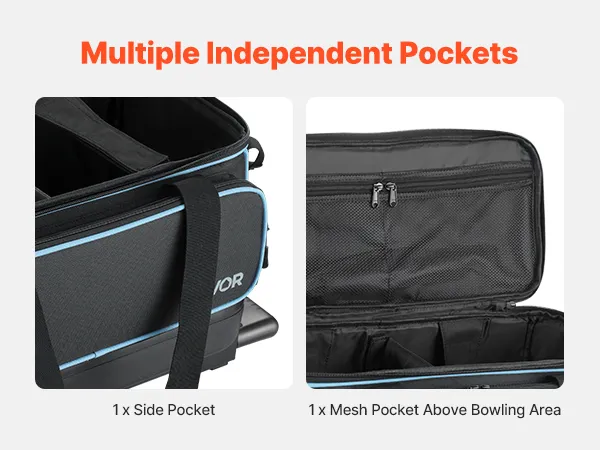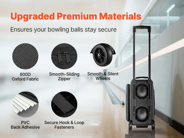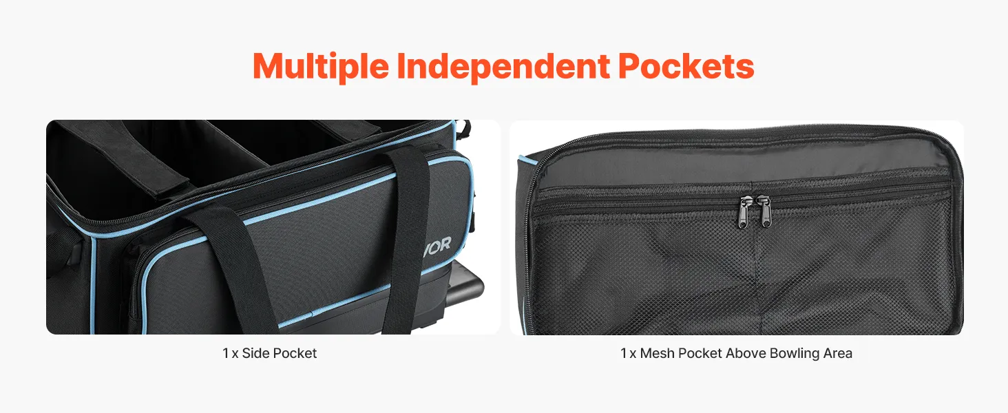 Material duradero: Fabricada con tela Oxford 600D con revestimiento de PVC, esta bolsa de bolos cuenta con un tablero de polietileno de 5 mm resistente a impactos en la base. Las costuras reforzadas y las cremalleras metálicas garantizan su durabilidad para uso frecuente y transporte a largas distancias
