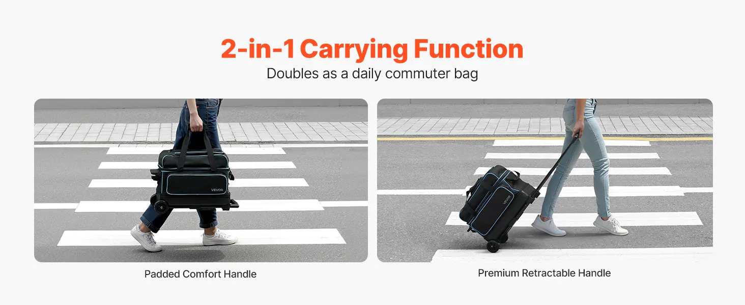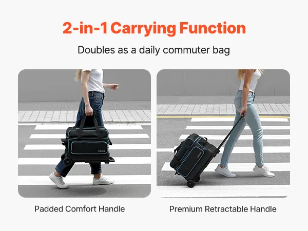 El mango telescópico ajustable y el mango con cierre del bolso de bolos con ruedas admiten los modos de transporte y arrastre, lo que aumenta la movilidad en un 55 %.