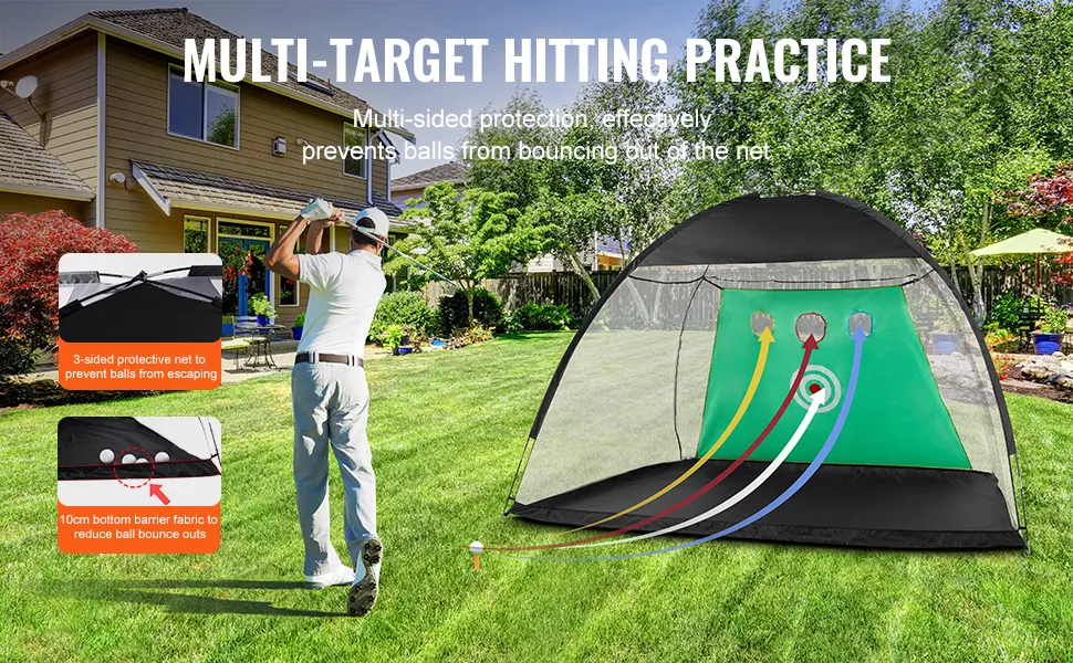 Red de práctica de objetivos múltiples: además de una gran área de golpeo, esta red de práctica de golf cuenta con tres áreas de objetivos adicionales, perfectas para practicar swings, chips y tiros. La red protectora en los lados y en la parte superior evita que las bolas salgan despedidas con fuerza, mientras que la barrera inferior reduce el rebote de las bolas, lo que lo hace adecuado para todos los entusiastas del golf.