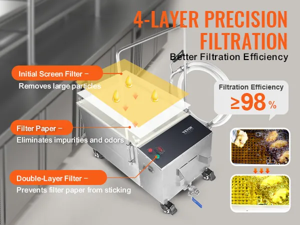 Nuestra máquina de filtrado de aceite para freír viene con una primera rejilla de filtrado, papel de filtro y un filtro de doble capa mejorado. ¡Disfrute de un aceite más limpio con más del 98% de residuos eliminados y ahorre en costos de cambio de aceite!