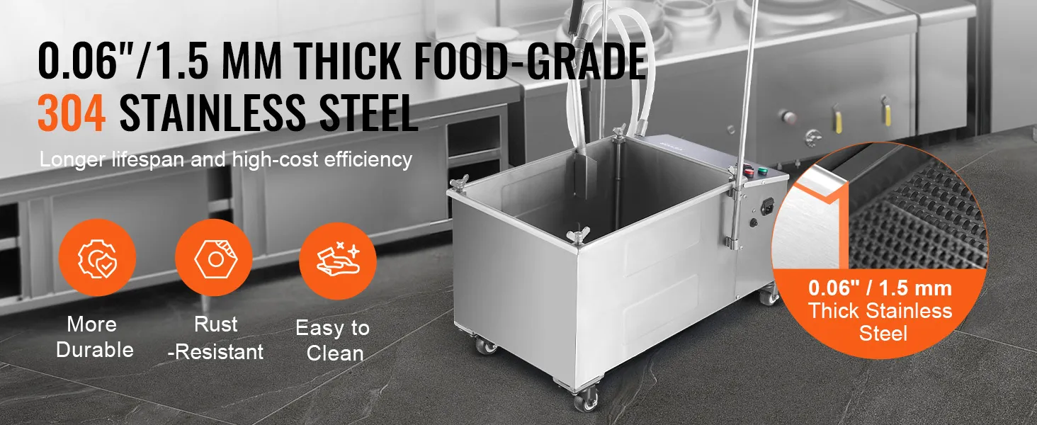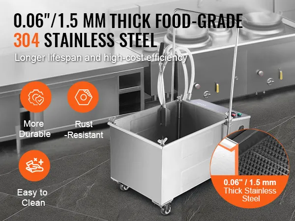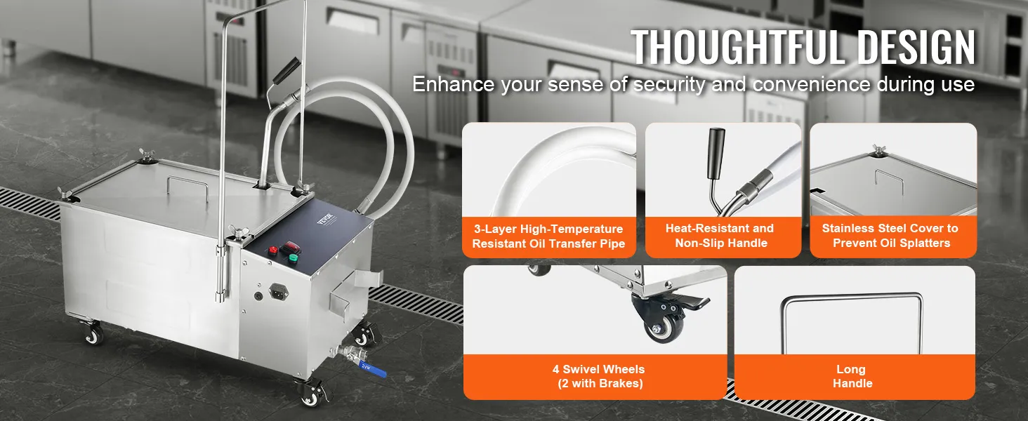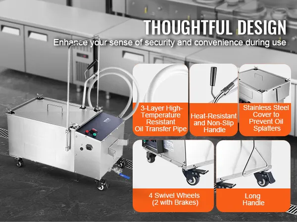 Con una manguera de aceite resistente a altas temperaturas, un mango anti-quemaduras y una tapa de acero inoxidable, el aceite se puede filtrar fácilmente. Con cuatro ruedas giratorias y un mango largo, mover este filtro para freidora profesional también es muy fácil.