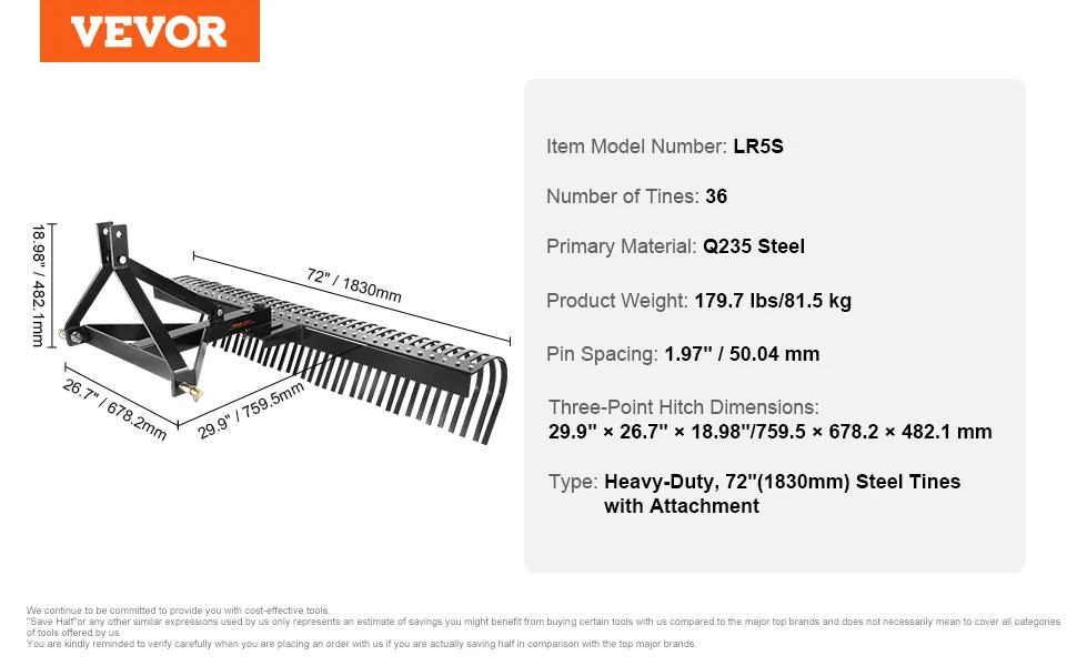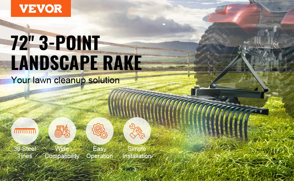 Esta escarificadora remolcable permite limpiar el jardín de forma rápida y eficiente. Es perfecta tanto para césped como para áreas boscosas. Con 36 púas de acero, el trabajo se realiza rápidamente. Puede confiar en ella para mantener su jardín ordenado. El ancho de 72 pulgadas cubre más terreno, lo que le permite ahorrar tiempo y esfuerzo. Esta escarificadora es esencial para cualquier persona que tenga un jardín grande porque su construcción robusta garantiza un uso duradero. Por lo tanto, facilite sus tareas de limpieza con esta herramienta confiable.