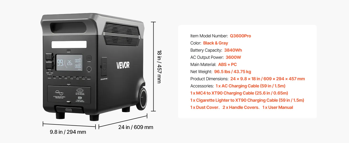 VEVOR Estación de Energía Portátil de 3600 W y 3840 Wh, Generador Solar con 10 Puertos de Salida, 6 Niveles de Potencia de Entrada Ajustables y Batería de Respaldo LiFePO4, 609 x 294 x 457 mm