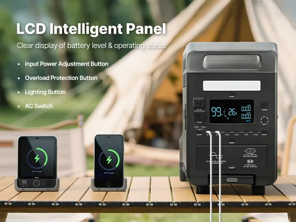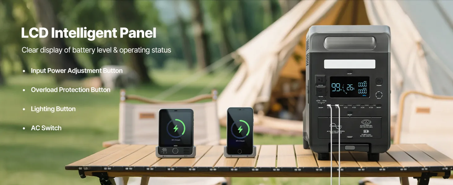 Su gran pantalla LCD muestra claramente el nivel de batería y el estado de funcionamiento. Admite 5 niveles de potencia de entrada ajustables(400 W, 800 W, 1200 W, 1600 W y 2200 W máx.), lo que le permite elegir con flexibilidad la configuración adecuada para diferentes situaciones.